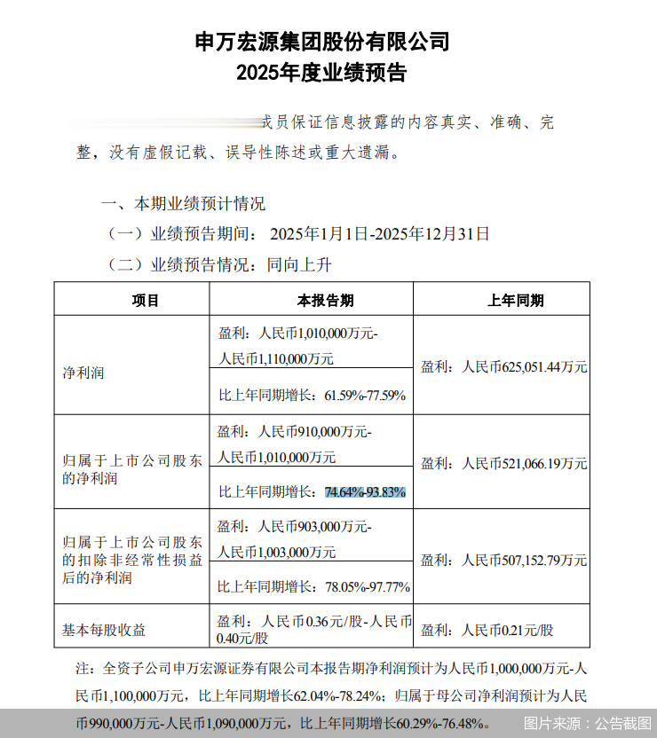 其中,全资子公司申万宏源证券2025年净利润预计为100亿元—110亿元,比上年同期增长62.04%—78.24%;归属于母公司净利润预计为99亿元—109亿元,比上年同期增长60.29%—76.48%。