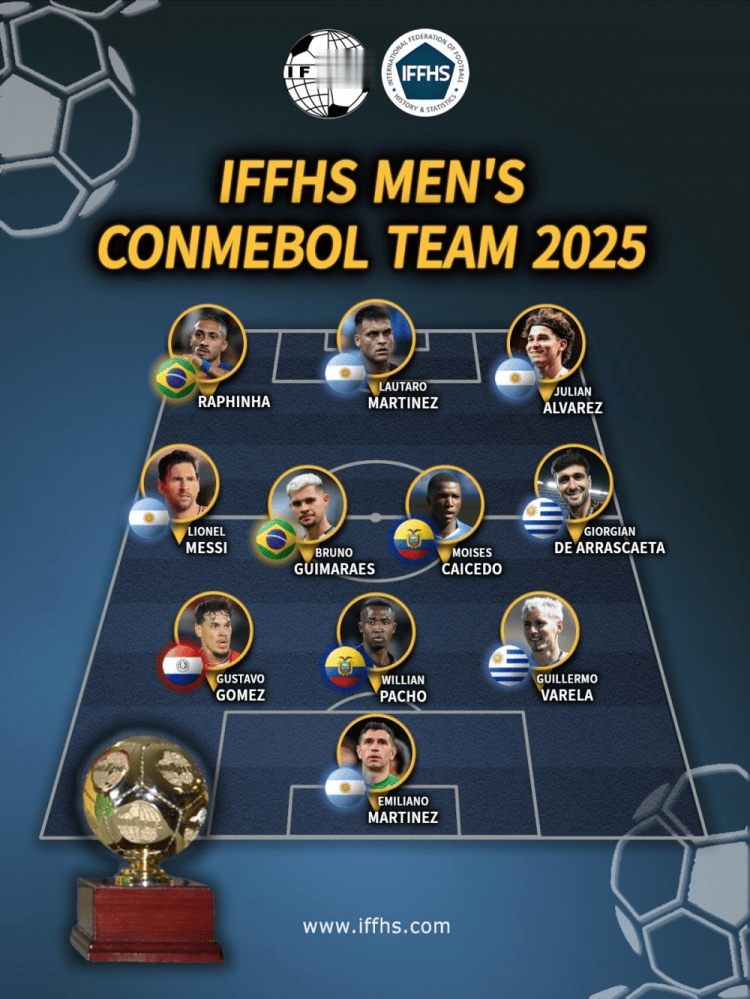 虎扑01月27日讯IFFHS(国际足球历史和统计联合会)在其官网公布了2025年南美足联年度最佳阵容。