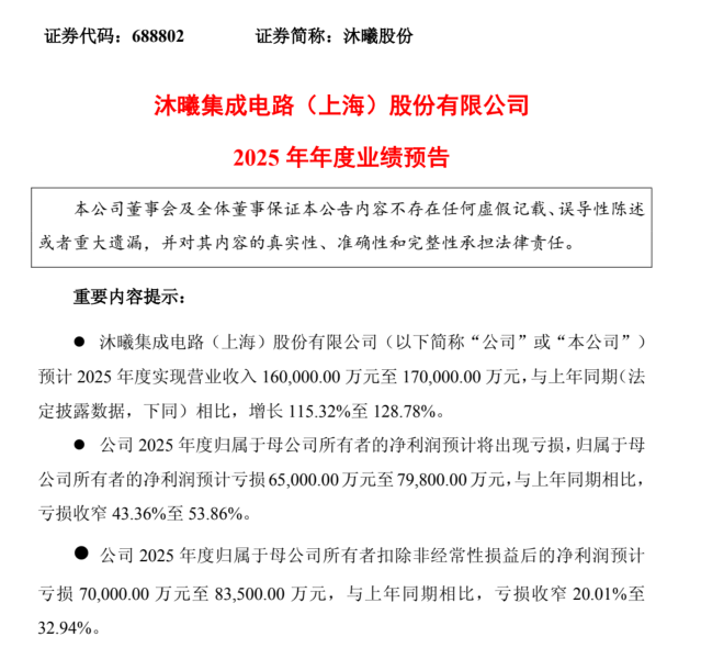 沐曦股份预计2025年度实现营业收入16.00亿元至17.00亿元,与上年同期相比,将增加8.57亿元至9.57亿元,增长115.32%至128.78%;预计2025年度归母净利润为亏损6.50亿元至7.98亿元,与上年同期相比,将减少亏损6.11亿元至7.59亿元,亏损收窄43.36%至53.86%。