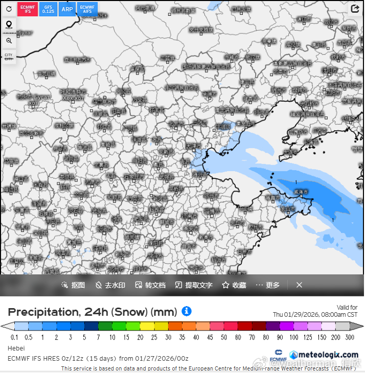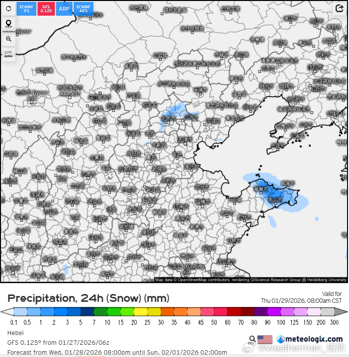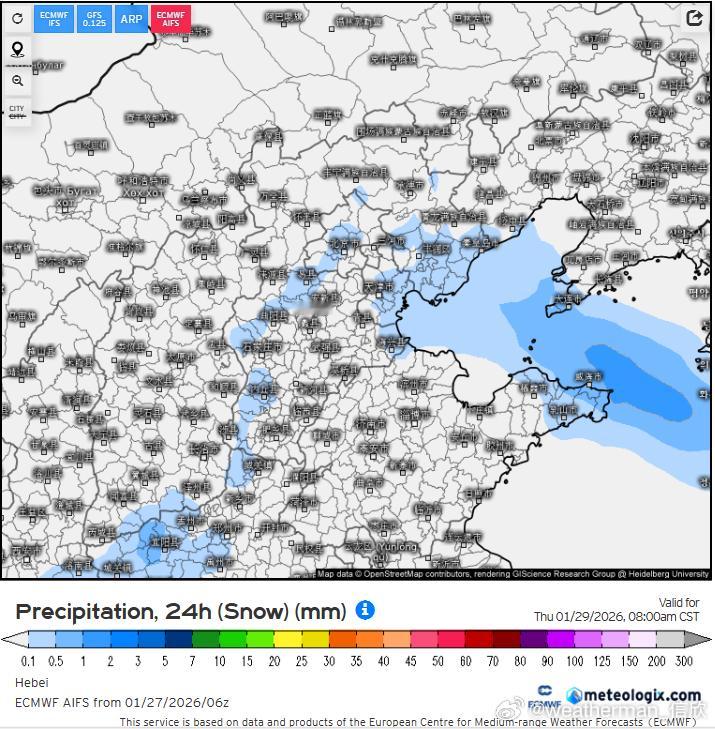 【回流降雪?】目前形势预报看,28日夜间-29日晨,北京存在回流降雪的可能性。冷空气从渤海拐弯,东风回流进入天津和北京,遇到地形抬升,形成降雪。目前我国数值(图3)、美国数值(图4)、欧洲AI模式(图5),都有反映。但欧洲报(图6)没有给出降雪。上次过程,欧洲报有,我国和美国报无,实际降雪不多,我国和美国报相对更准确。看这次谁对。