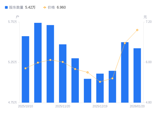 日期A股户数(户)流通A股户均持股数(股)户均持股市值(万元)2026-01-205424110752.217.482026-01-095498910605.956.972025-12-315143911337.916.262025-12-195109811413.576.192025-12-105045211559.726.592025-11-285299611004.816.382025-11-205472310657.516.412025-11-105711710210.816.202025-10-205739010162.246.092025-10-105573710463.626.09