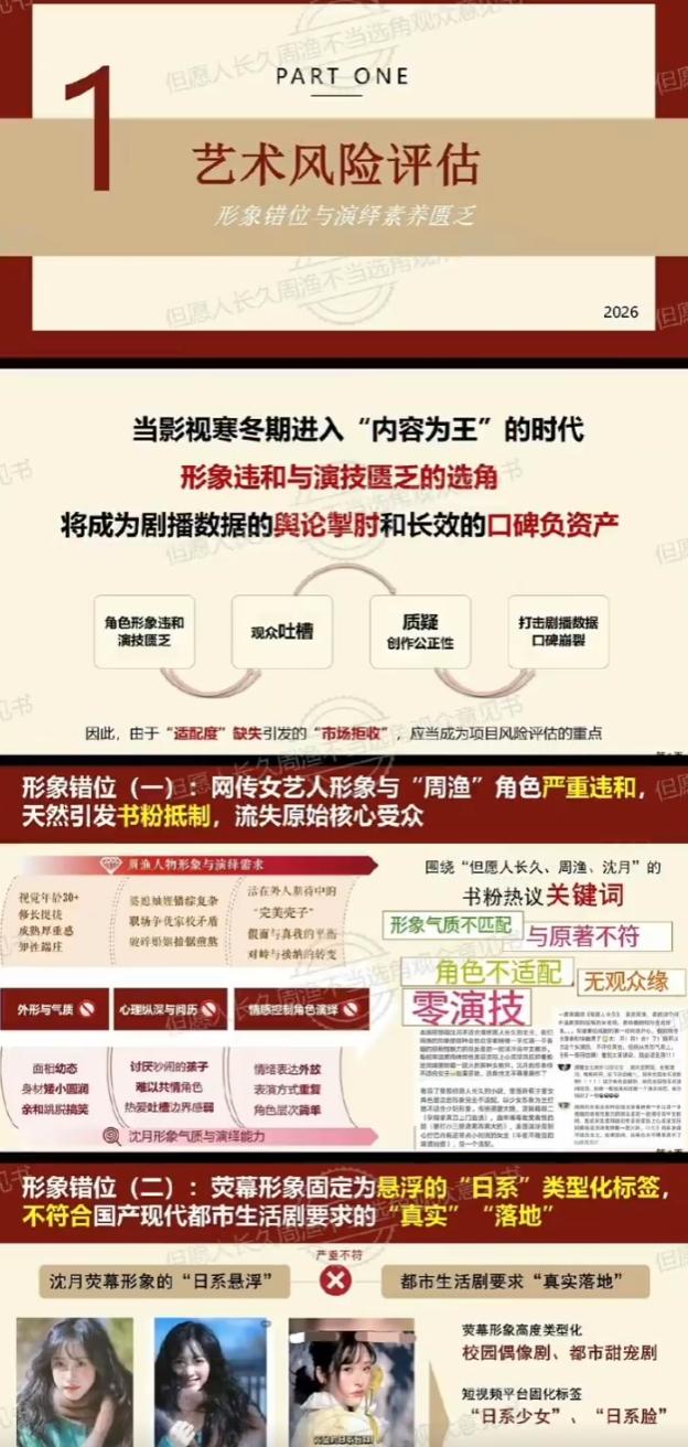 张晚意粉丝为为了拒绝沈月做了一份PPT! 看来张晚意是肯定会接《但愿人长久》这个剧本了,粉丝为了拒绝沈月出演女主,做了个超长APP,一看就很专业,还做了很多调研和分析,没几百块钱都做不出这样的APP,俩人还没合作上,就已经尴尬上了,作为一部家庭年代剧来说,对张晚意加成不大,他类似的作品有好几部,但是如果沈月接了,而且演技有突破的话,对她加成很大,她过往作品局限性很大,需要突破。