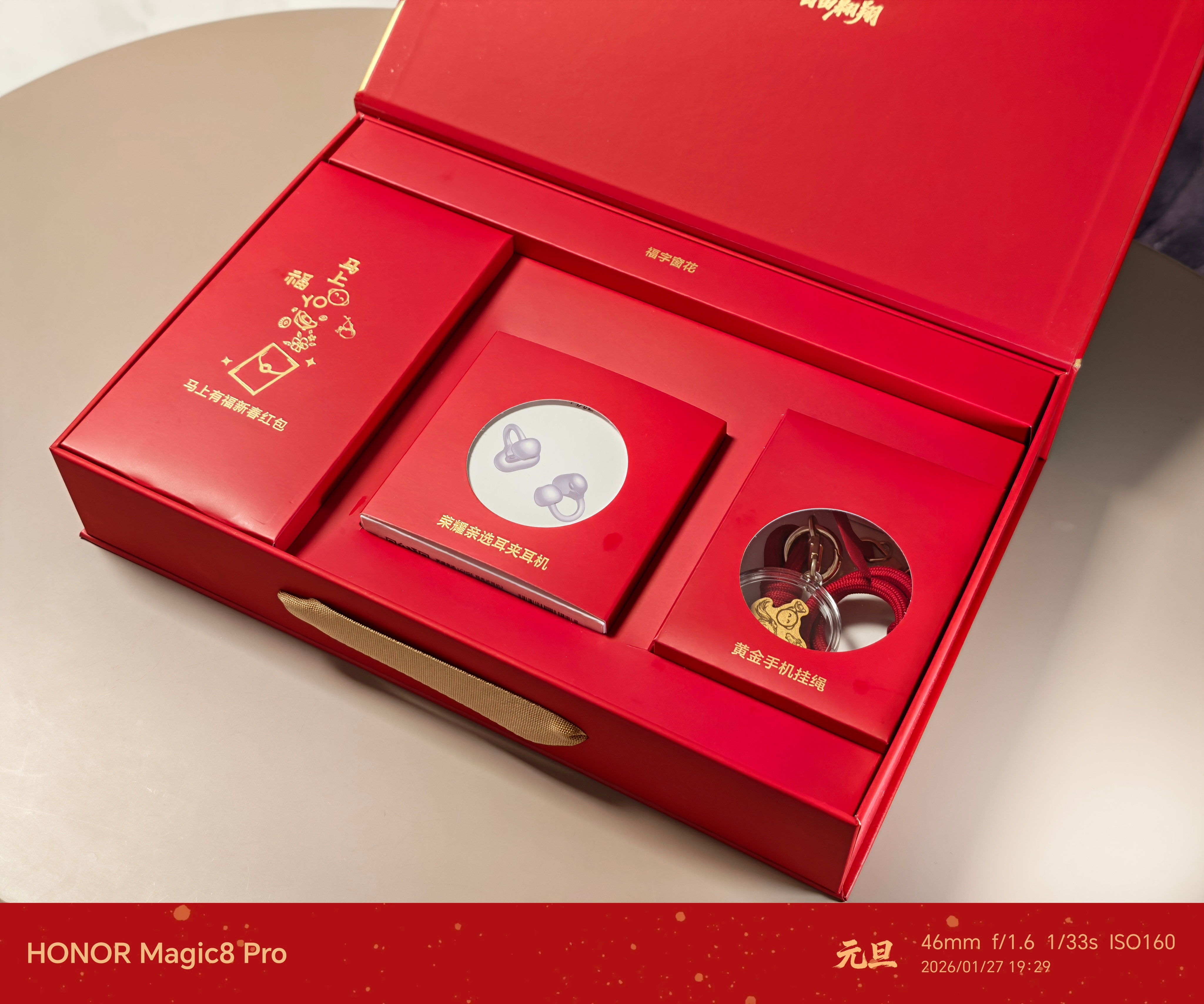 新年的第一份祝福是荣耀给的!一套马年新年礼盒,有耳夹式耳机,纯金吊牌手机挂绳,还有红包🧧和窗花!节日的氛围感瞬间拉满!新的一年也祝荣耀手机 大麦!
