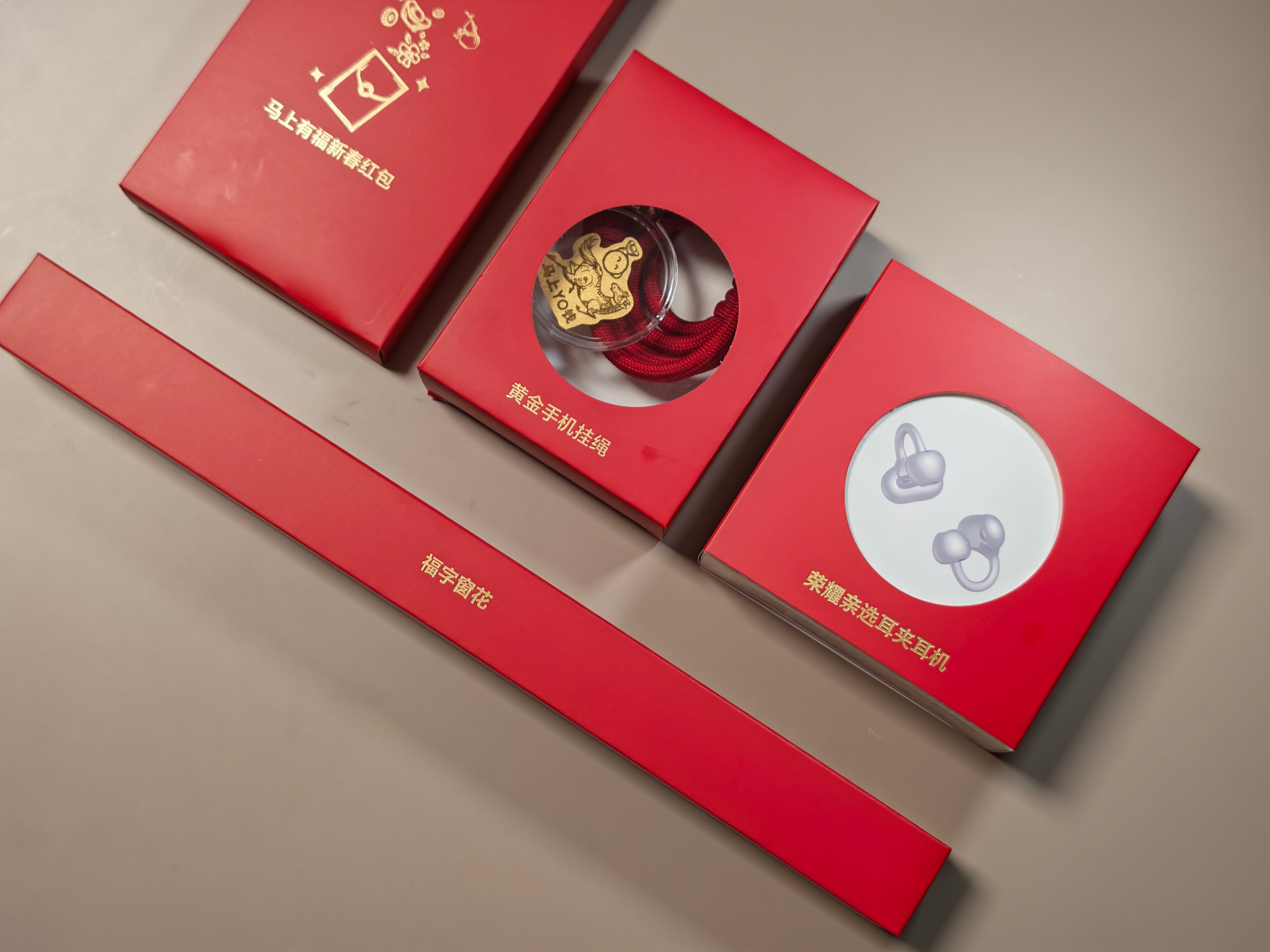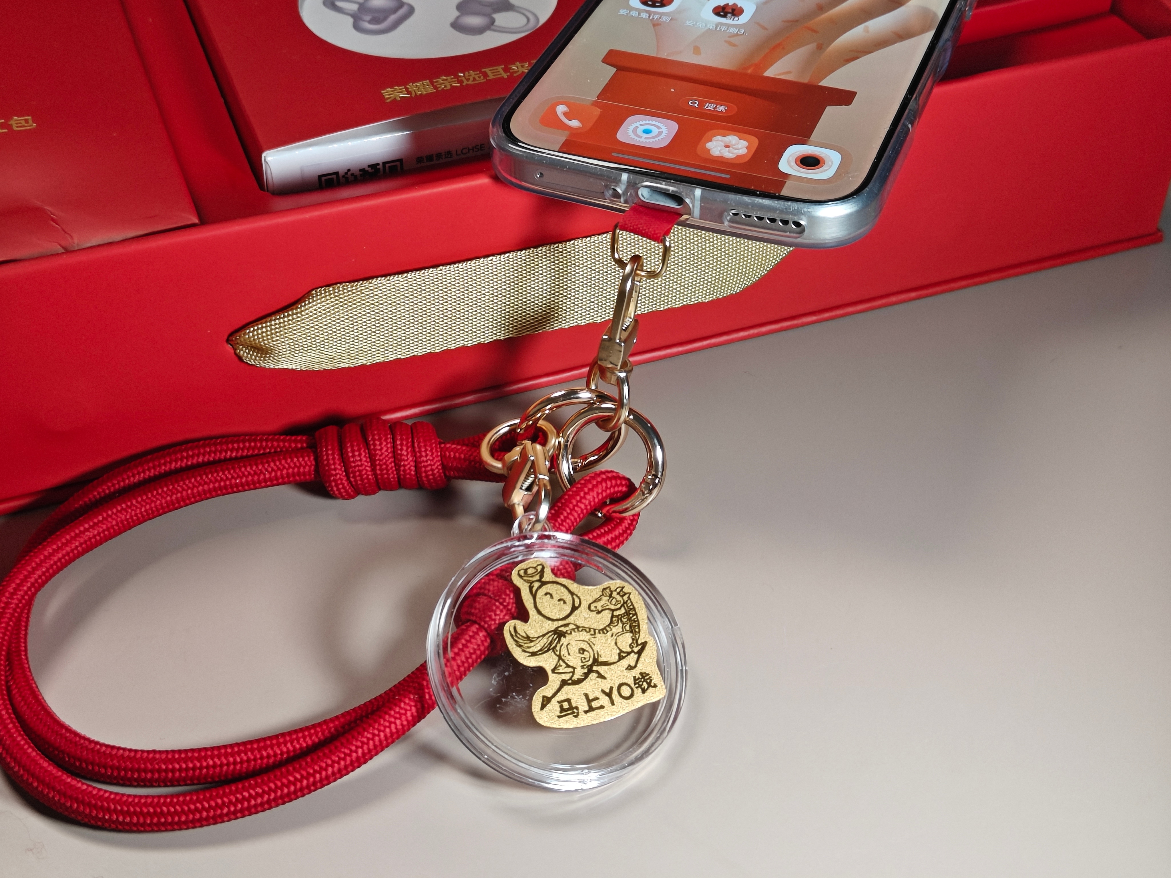 新年的第一份祝福是荣耀给的!一套马年新年礼盒,有耳夹式耳机,纯金吊牌手机挂绳,还