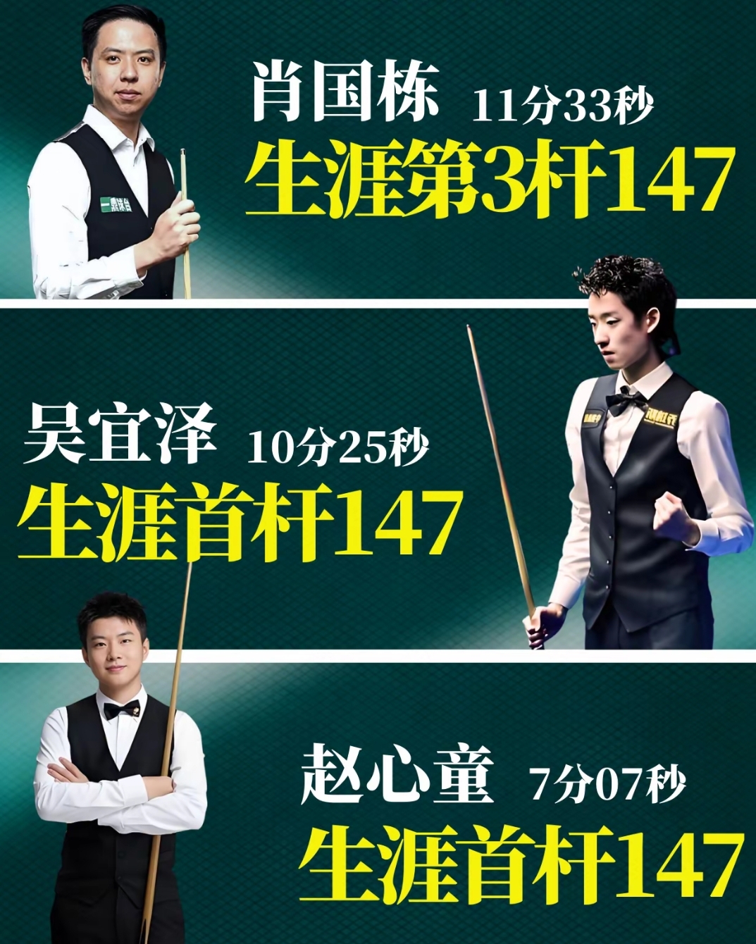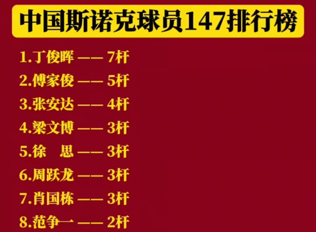 值得一提的是,本届冠军联赛共有3人打出147满分杆,另外两位也是中国球员,他们是同样轰出职业生涯首杆147的吴宜泽和肖国栋,分别用时10分25秒、11分33秒。