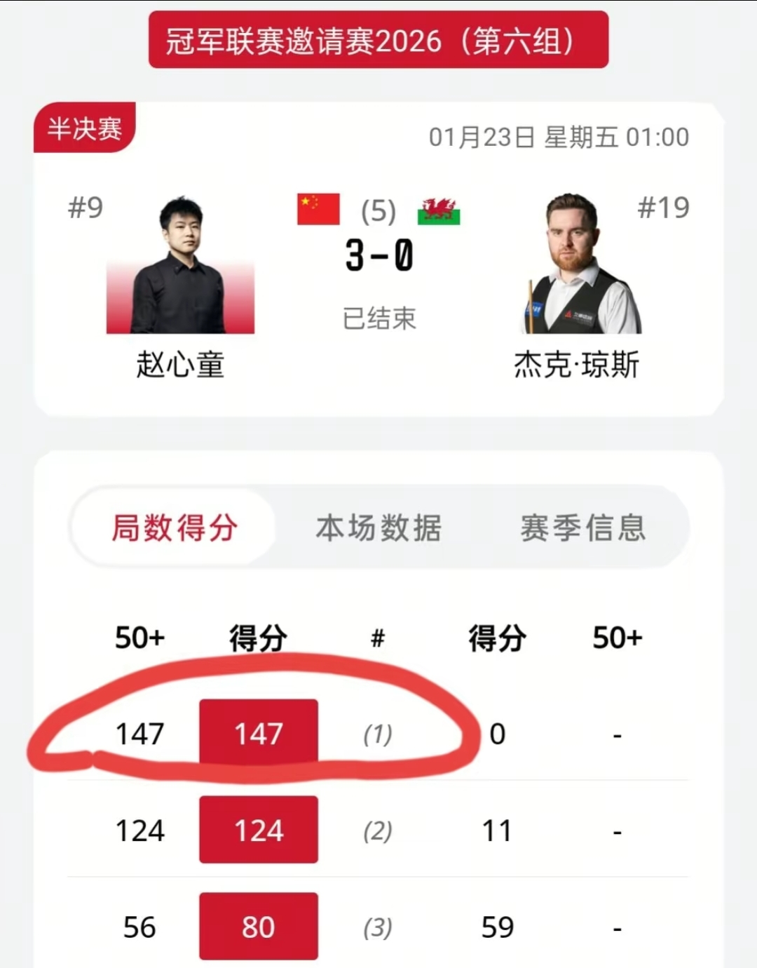 2026年1月23日凌晨,斯诺克冠军联赛第6小组半决赛,赵心童对阵杰克·琼斯时,打出了个人职业生涯的首杆147分满分杆,该杆147出现在半决赛的第一局。