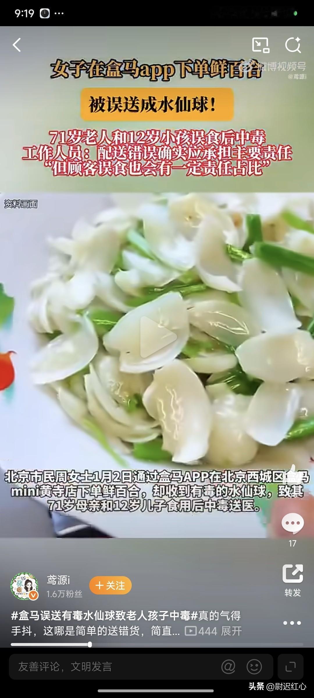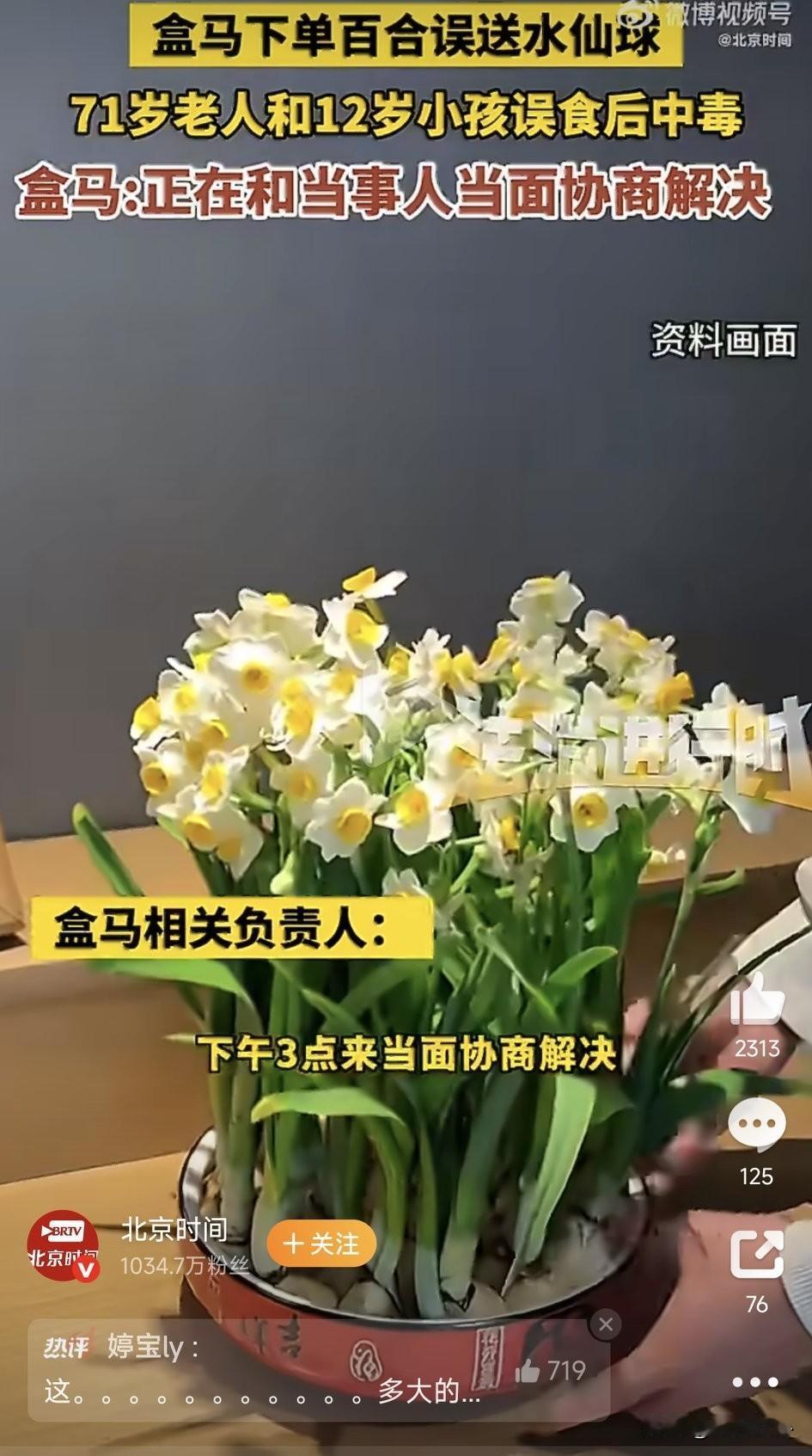 这下好了 喜欢盒马,不喜欢盒马的 都要一起沉默了,谁能想到盒马误送有毒水仙球致老人孩子中毒 在盒马买份鲜百合,竟让71岁老人和12岁孩子误食水仙球中毒,还因误判延误6小时送医。老人出院后胃伤难愈、体重骤降,孩子健康需长期关注,家属也被失眠焦虑缠身,这并不是购物失误,而是把普通家庭拖进了无尽煎熬。 更寒心的是品牌后续态度,起初承诺全责,转头就推诿扯皮,甚至让无过错家属担责。市监局协调的7万打包赔偿连明细都没有,面对一家人的身心伤害,这般处理毫无愧疚与敬畏。作为信赖的大品牌,分拣失误的错本该全权承担,怎么可以让普通家庭默默扛下所有伤害? 水仙鳞茎毒性极强且无特效药,误食可能危及生命,它和百合的外观差异, 本是专业平台的基本甄别底线,可如此低级的错误还是发生了。法律早已界定盒马全责,可老人受的罪、孩子遭的苦,哪是冰冷赔偿能抹平的? 真心希望家属的合理诉求被正视,老人孩子能得到足额补偿和后续救治。食品安全从不是空话,每一次分拣配送都是人命底线。 也提醒大家,水仙极易和百合、洋葱混淆,选购务必仔细分辨。若不慎误食,第一时间催吐、喝牛奶或蛋清护胃,带剩余样本尽快就医,别让小疏忽酿成大悲剧。大家觉得呢?