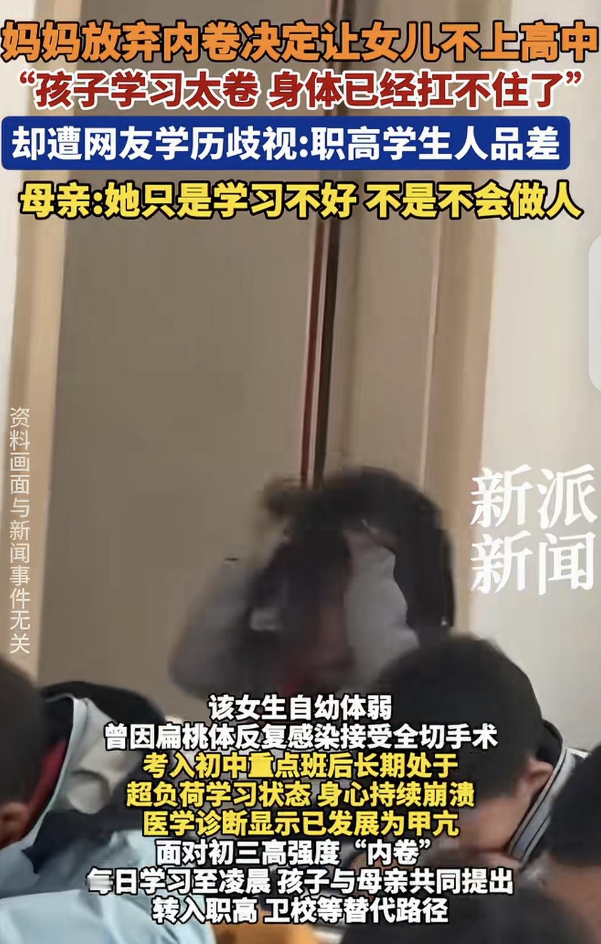 “太卷了!”江苏,一女子的女儿上初三,卷到每天学习到凌晨,女儿不堪重负,累到扁桃体发炎做了全切手术,即将发展成“甲亢”,女儿身体扛不住了,她跟女子商量,不想读高中,只想读个职高。不料却遭到网友学历歧视:职高学生人品差。女子哭了:我女儿只是学习不好,不是不会做人! 一女子的女儿从小体弱多病,她养育女儿的过程中,可以说艰辛不已,三天两头上医院,心力交瘁。 女儿上初中,考进重点班后,学习压力剧增,每天都学到凌晨,长久的超负荷,导致女儿的身心处于崩溃边缘,她的扁桃体反复发炎感染,最后做了全切手术。 这还不算,医生告诉女子,如果再这样下去,她的女儿就会发展成“甲亢”。 甲亢大家都知道,不但身体受折磨,人的外貌也会发生很大变化,眼睛凸起,很是可怕。 终于有一天,女儿实在扛不住了,跟女子提出,她不想读高中了,只想进一所职高,学一个安身立命的一技之长算了。 女子会如何做决定呢?如果再这样下去,女儿的身体垮了,还有什么前途可言? 对于一个母亲来说,虽然她也希望孩子成龙成凤,但也得从实际情况出发,如果女儿的健康没了,谈何美好的未来? 所以,对于女子来说,只要女儿平安健康快乐就好,她接受女儿的平凡,她有权选择自己想要的生活。 女子同意女儿的提议,放弃内卷,健康重要。可万万没想到,大家对这母女的选择评头论足,说三道四,直接学历歧视,说什么职高=黄毛,职高学生人品差,环境差…… 听到网友们偏激的言论,女子痛彻心扉,女儿读高中,会继续遭遇身心折磨,女儿读职高,竟然不卷了,又遭受精神折磨。 女子哭着发视频,为女儿发声:她只是学习不好,不是不会做人,别再片面标签化了。 有人安慰女子,不要在意别人的看法,做自己喜欢的事情,做自己认为对的事情。适应自己才是最好的抉择。 有人说,其实不在于上普高还是职高,只是身边的学习环境和周围的同学,普高一般老师和父母还是管的多点,周围的同学大多没有小混混一类的。 而职高不说父母管不管,老师管你嘛?身边的同学又是怎样的?我一个外甥之前在我们这的读职高,我替他父母去开过一次家长会,老师对小孩要求很简单,只要不带管制刀具去学校就行,出了校门一大帮男孩女孩站路边抽烟,所以说环境能改变人,至于会变坏还是好,谁也不知道,学习不好光影响事业,还影响婚姻。 这位妈妈很懂自己的娃娃,不想逼娃娃,对娃娃来说,上学难,学不进去,其实可以选择她优秀的一面,也可以学一项一技之长。只要娃娃三观正,努力,也会过得很好,现在好多学历高的也找不到工作,还在向父母要钱。 这网友的学历歧视言论,真是让人愤慨!孩子学习不好想读职高,咋就跟人品差划上等号了?这偏见也太深了吧! 每个孩子都有自己的特点和优势,不是只有读普高、上大学才是唯一出路。 就像这女孩,身体都因为过度学习累垮了,还非要让她在不适合的赛道上硬撑,这不是把孩子往火坑里推嘛。 职高能让孩子学到一技之长,以后也能在社 会上立足,这有啥不好? 而且,人品好坏跟学历高低没有必然联系。职高里也有努力上进、品德优良的孩子,普高里同样可能存在调皮捣蛋、不务正业的学生。不能因为个别现象就给整个群体贴上标签。 家长能尊重孩子的想法,放弃内卷,看重孩子的健康,这是非常明智的选择。 孩子的未来有无数种可能,只要三观正、肯努力,不管走哪条路,都能活出自己的精彩。 应该摒弃这种片面的学历歧视,给孩子更多的理解和支持,让他们能在适合自己的道路上自由成长。 对此,你怎么看?