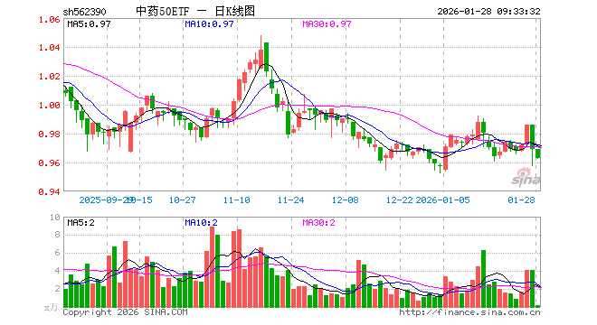 1月28日,中药50ETF(562390)开盘涨0.00%,报0.969元。中药50ETF(562390)重仓股方面,云南白药开盘跌1.20%,片仔癀涨0.89%,东阿阿胶涨0.00%,同仁堂涨0.23%,华润三九涨0.04%,吉林敖东涨0.05%,白云山跌0.16%,以岭药业跌0.95%,达仁堂涨0.02%,众生药业跌1.85%。