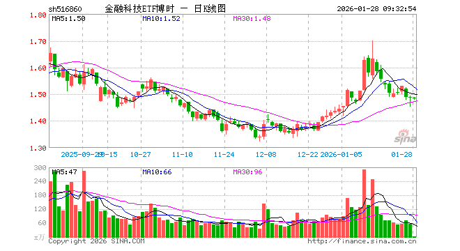 1月28日,金融科技ETF博时(516860)开盘涨0.00%,报1.485元。金融科技ETF博时(516860)重仓股方面,东方财富开盘涨0.00%,同花顺涨0.62%,指南针涨0.27%,恒生电子涨0.03%,润和软件涨0.25%,东华软件涨0.00%,新大陆跌0.32%,广电运通涨0.07%,银之杰跌0.28%,四方精创跌0.27%。