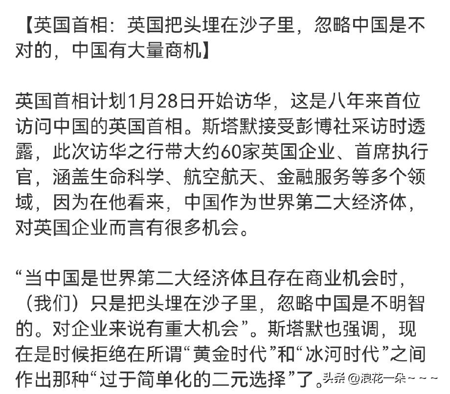 来了![击掌] 英国在沙子里埋了8年?终于在英国首相斯塔默身上爬出来了,不,不出意外今天下午或者晚上就要到达北京了。 他也说了,这次访华为了英国,为了英国企业家未来有大量的发展机会,不能忽视了我们这个世界第二大经济体。接下来就看英国首相的实际行动吧,也要看看到底带来了什么大礼?如果礼物还可以的话,我感觉到,沙子将会变成金子。[捂脸]