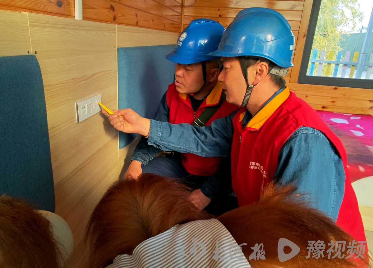 1月26日,河南省沁阳市和生森林动物乐园里红毛猩猩的房间内涌来阵阵暖流,两只可爱的红毛猩猩,正在与饲养员嬉戏玩耍,尽情享受冬日时光。一旁身穿工装头戴安全帽的国网沁阳市供电公司丹河中心供电所工作人员,正手持仪器对房间内开关、空调等线路的接头温度进行测温排查。