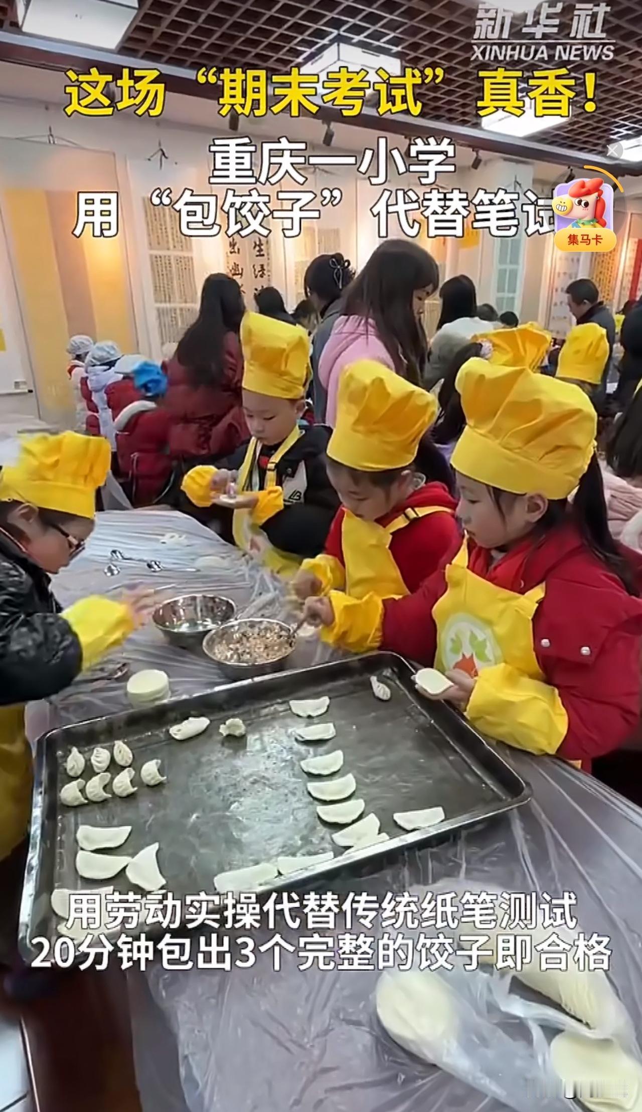 “重庆这所小学火了!期末考试不做题,竟让娃们包饺子!据悉,该小学不用提笔做题,取而代之的是一场热火朝天的包饺子大赛。20分钟内包出3个完整的饺子,就算顺利合格。 消息一出,网友们的讨论直接炸开了锅,有人笑着调侃:“这考试也太香了,考完还能直接加餐!” 还有人点赞:“这样的考试,孩子哪还会有压力?” 在周少看来,这所小学的做法,算得上是教育理念的一次暖心尝试。传统笔试固然能检验知识掌握情况,但动手实践,何尝不是一种重要的成长课题? 它没有用统一的标准答案框住孩子,反而给了他们释放天性的空间。在擀皮、填馅、捏褶的过程里,孩子们学到的不只是包饺子的技巧,还有对劳动的敬畏与热爱。 总之,周少觉得教育本就该多一些这样的“烟火气”,少一些刻板的条条框框,让孩子在体验中收获成长,才是最实在的教育方式。 换句话说,比起冷冰冰的分数,这场实操考试,更能看出孩子们的动手能力和专注力。这种创新方式,值得称赞!#寻美三湘# #长沙新朋友#