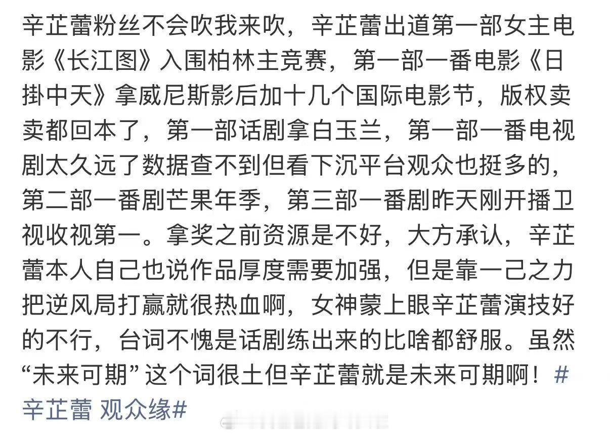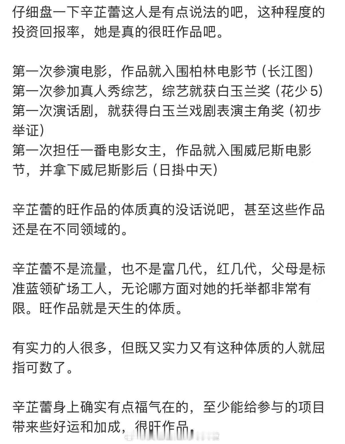 辛芷蕾的项目回报率有网友问辛芷蕾的项目回报率是不是很高?第一部女主电影就入围柏林电影节主竞赛,第一部一番电影就拿了威尼斯影后,第一部话剧拿了白玉兰戏剧奖。去年今年连着两部电视剧收视都很不错,仁心俱乐部芒果年季,女神蒙上眼昨天酷云已破0.65拿下卫视第一