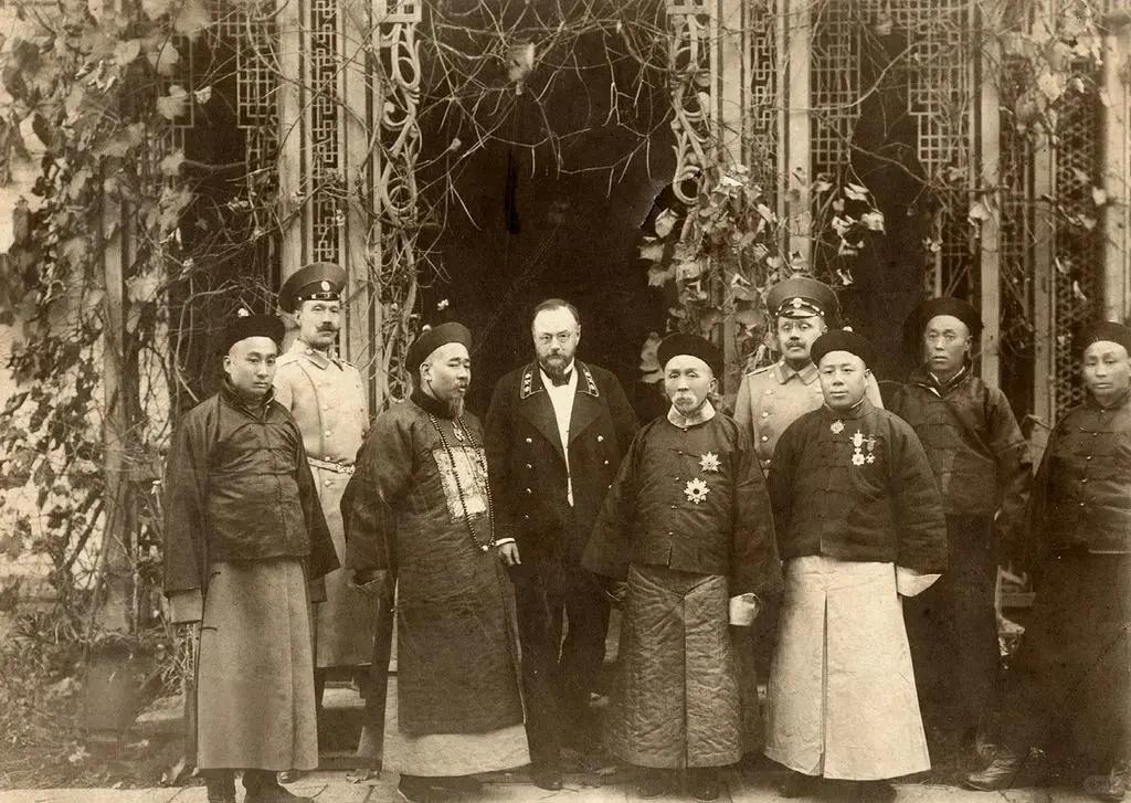 1908年,法国驻成都领事韦礼德到任不久,时任四川总督赵尔巽亲自接见,现场还有德国驻成都领事及天主教传教士,洽谈结束后,参会人员拍了合影。 前排左二为时任四川总督的赵尔巽,是此次外交会面的东道主;前排左三为其弟、时任四川边务大臣的赵尔丰,二人共同构成了晚清西南政坛的核心力量。