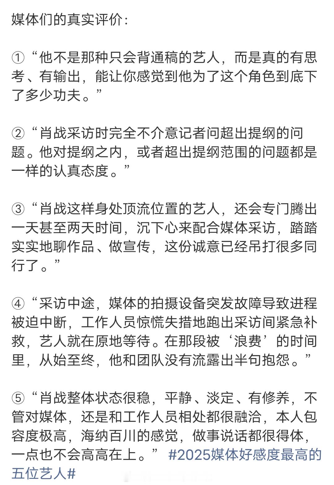 2025媒体好感艺人top1是肖战,媒体夸他有思考有输出,能感受到是真的为角色下足了功夫。和媒体、工作人员都相处融洽,说话做事很得体,包容度极高,海纳百川的感觉。2025媒体好感度最高的五位艺人肖战2025媒体好感艺人top1