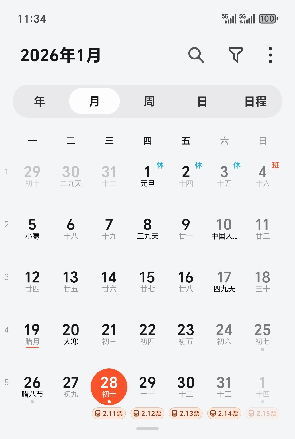 MagicOS日历更新,更新后可以在日历上显示春运订票的时间,比如今天28日可以