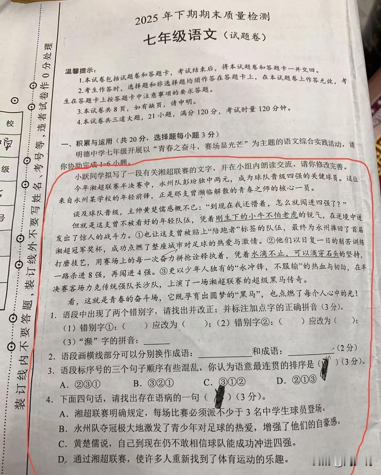 网友爆料:小学三年级和七年级语文考试试卷都出现湘超“永州”队相关的题目,遭到众多网友关注和质疑! 有网友质疑说,小学生考试,考题“湘超”,这个也太儿戏了吧。 也有网友则表示,这里是冠军,这是荣耀,是荣誉铭记于心。 还有网友则认为,考的又不是足球知识和比赛内容,这就是看拼音写词语,词语是否表述正确,都是基础知识。 那么问题来了,大家觉得这样的题目出的问题吗?#寻美三湘# #长沙新朋友#