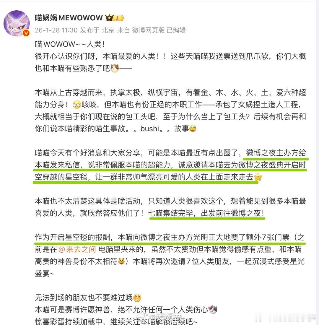微博之夜 星空毯 喵娲娲直接把一片星空搬到了红毯上!艺人们站在上面,仿佛自带浪漫的bling滤镜。门票已抢到,就静静等待自家艺人在上面拍出惊艳全场的星空神图了。