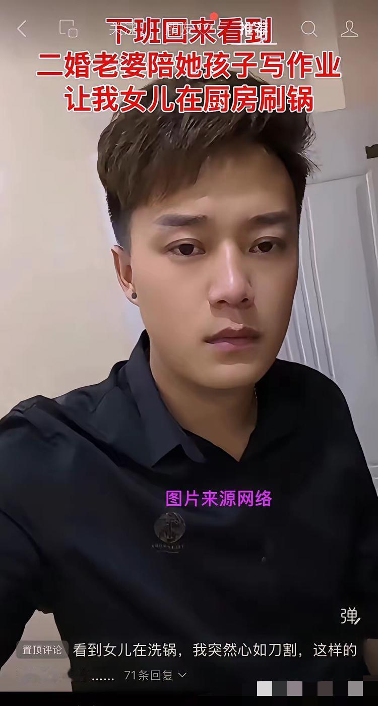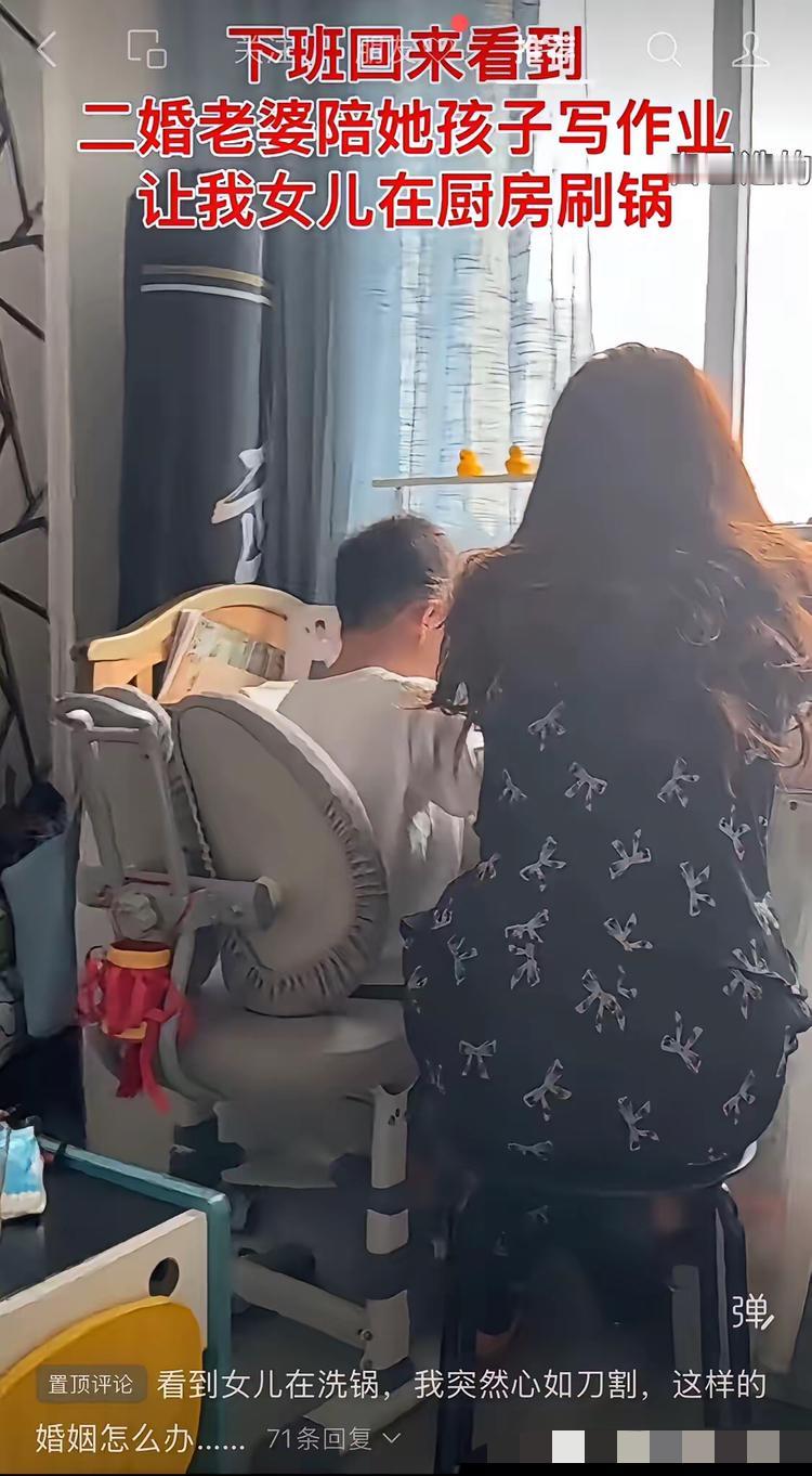 男子推开门的瞬间,连呼吸都僵住了,满心酸涩直冲天灵盖,原来二婚里最受伤的从来都是孩子,而自己竟是亲手将女儿推入委屈深渊的人!厨房昏黄灯光下,女儿小小的胳膊搭在冰冷水池边,小手泡得发白,攥着比手掌还大的洗碗布费力擦着碗沿,袖口溅满水渍也浑然不觉,客厅里却亮堂温暖,二婚妻子正温柔俯身,手指轻点作业本,耐心陪着自己的孩子写作业,一冷一暖,一忙一闲,这般刺眼的对比,像根淬了冰的针,狠狠扎进他心里,疼得他喘不过气。 他恍惚想起从前,女儿是他捧在手心怕摔了、含在嘴里怕化了的宝贝,在家连杯水都不用自己端,他恨不得把全世界的温柔都给她,可重组家庭后,曾经娇憨的小公主,竟悄悄长成了默默做事的小大人,连撒娇都成了奢望。他总以为,自己拼命赚钱撑起这个家,给女儿找个妈妈,就是对她好,能让她拥有完整的家庭和母爱,却从没蹲下来问过女儿愿不愿意,更没看清,这份他期盼的母爱,从来没真正落在女儿身上。 这些年他早出晚归,总觉得把钱交到家里,让孩子吃饱穿暖就是尽了责任,却偏偏忽略了藏在细节里的偏爱与冷落。女儿从没跟他抱怨过一句,每次他回家,总会乖巧端上一杯温水,默默收拾好家里的杂物,他还傻傻以为孩子长大了懂事了,如今才幡然醒悟,那根本不是懂事,是孩子在陌生的家里,用小心翼翼的讨好,寻求一丝安稳,这份懂事背后,藏着多少委屈和不安,他不敢细想。 他不是不能理解妻子疼自己的孩子,血浓于水的牵挂本就无可厚非,可他忍不了的是,妻子把这份疼爱,变成了对女儿的忽视和区别对待。同样是孩子,一个在书桌前被细心呵护、耐心教导,一个却在厨房里独自扛起家务,小小年纪就学着迁就和忍让,孩子的心最敏感,这份偏心,她看在眼里、记在心里,受的伤比大人想象的要深得多。他终于明白,自己这段二婚里,最亏欠的就是亲生女儿,为了维系所谓的家庭和睦,他一次次忽略女儿的感受,甚至偶尔看到她做家务,还劝她多懂事、多体谅继母,却忘了,她也只是个需要被人捧在手心、护在身后的孩子啊。 此刻他的内心像一团乱麻,剪不断理还乱,纠结得快要窒息。他不是没想过离婚,可一想到女儿刚勉强适应这个家,再经历一次家庭破碎,会不会更自卑、更受伤,会不会觉得是自己的错,才让爸爸再次失去婚姻,他就满心愧疚。可如果不离婚,看着女儿每天在这个家里受委屈,看着她小小的身影承担着不属于这个年纪的家务,看着她眼里的光一点点黯淡,他这个当爹的,心里的痛就一刻也停不下来。 他总算看透,二婚家庭最可怕的从来不是重组本身,而是大人做不到一碗水端平,用自己的偏爱,把对方的孩子逼成了这个家里的外人。他拼命赚钱养家,养着妻子和她的孩子,却让自己的宝贝女儿受了这么多苦,这根本不是他想要的生活,更不是当初重组家庭的初衷。其实二婚家庭的幸福,从来不是靠一个人的忍让和付出就能撑起来的,而是需要夫妻两人都拿出真心,摒弃私心,把对方的孩子当成自己的孩子来疼爱,不偏不倚、平等对待。 偏爱从来都藏不住,哪怕一点点差别对待,都会在孩子心里留下一道疤,这道疤会跟着孩子一辈子,影响她的性格和未来的人生。他现在最该做的,不是纠结要不要离婚,而是先挺直腰杆,做女儿最坚实的后盾,明确告诉妻子,女儿是自己的底线,这个家里所有孩子都该被平等对待,没有例外。如果妻子真的想好好经营这个家,就该收起偏心,看到女儿的委屈和不易,拿出真心去关爱她、呵护她,弥补之前的亏欠;如果妻子始终做不到一碗水端平,始终偏袒自己的孩子,那这样冷冰冰、充满偏心的家庭,就算表面完整,也毫无温度可言,留着只会继续伤害女儿,不如趁早放手。 孩子的成长只有一次,没有重来的机会,比起一个看似完整却满是委屈的家,孩子更需要的是被爱、被重视、被公平对待的温暖。重组家庭的意义,从来不是找个人凑活过日子,而是找个能一起并肩同行、一起善待彼此孩子的人,给所有孩子一个真正有温度、有爱的家。毕竟对孩子来说,最好的家庭不是有多富裕,而是有人疼、有人护,能在爱里安心长大,愿所有重组家庭的父母,都能守住初心、摒弃私心,别让偏心,毁了孩子的一生。 ​​各位读者你们怎么看?欢迎在评论区讨论。