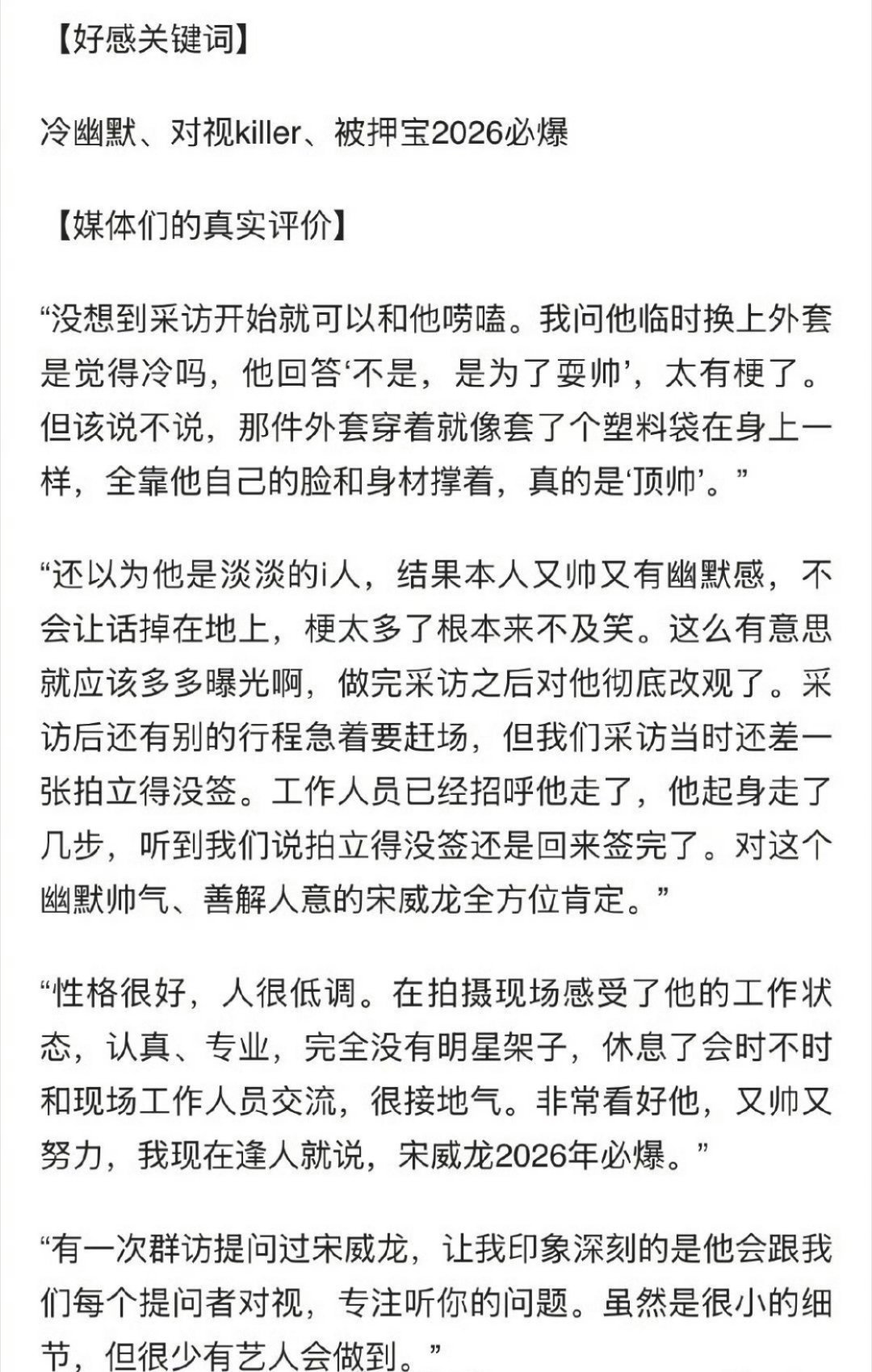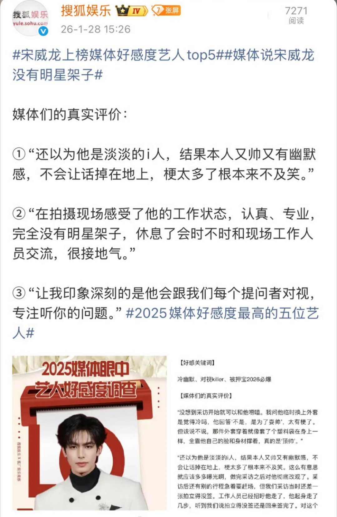 宋威龙 上榜2025媒体好感度艺人top5,媒体们评价🐉是幽默接地气的内娱顶帅