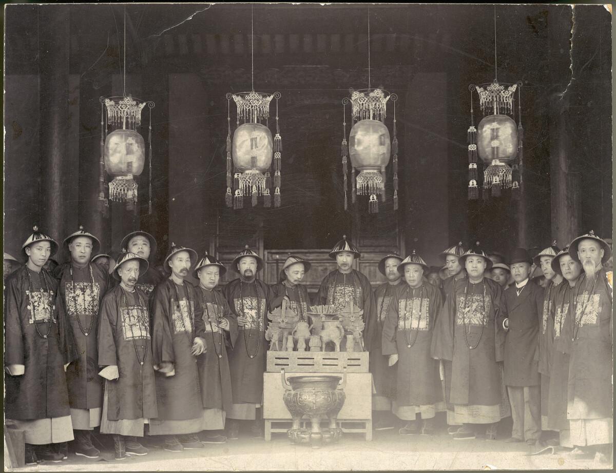 这张照片拍摄于1907年,晚清重臣两江总督端方与僚属围绕著名的柉禁器组拍摄的重要影像。合影中的器物是端方最重要的青铜器收藏之一 ——柉禁器组,它是一套西周时期的青铜酒器,包含禁、卣、爵、觚等多件器物,是中国现存最完整的西周青铜禁器组。 柉禁器组原是陕西出土的国宝级文物,端方以重金购得后,成为其 “陶斋” 收藏的镇馆之宝。这套器物后来几经流转,现主要收藏于美国大都会艺术博物馆与天津博物馆。