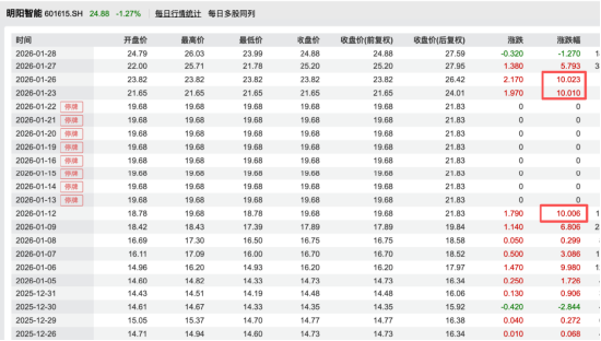 1月12日当天,明阳智能股价以涨停收盘。随后公司股票自1月13日起停牌。1月23日复牌,股价再度一字涨停。更早之前,从1月6日至1月12日,短短5个交易日内,明阳智能股价已两次涨停,累计上涨33.60%。