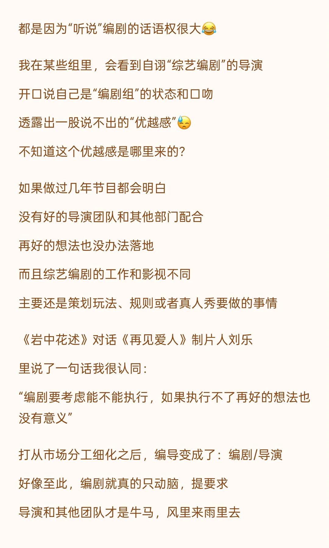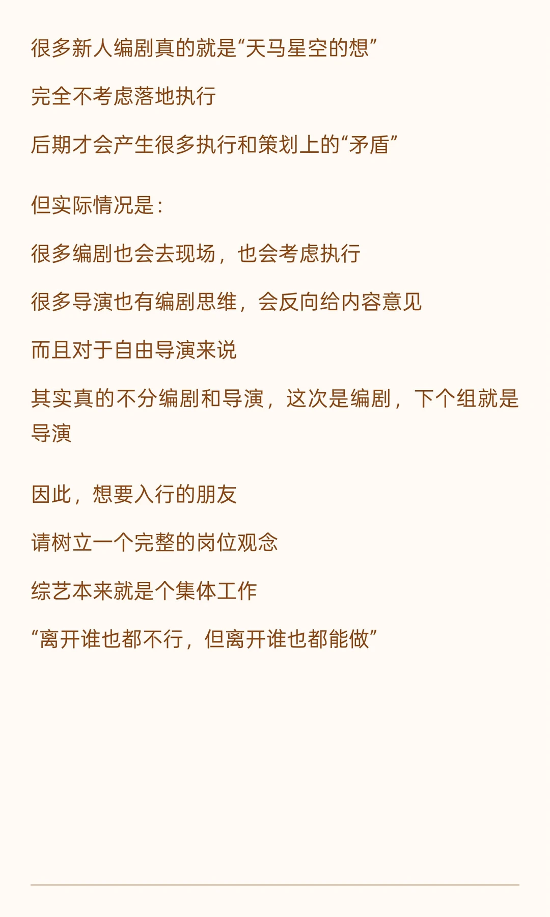 综艺编剧是内容核心,但并非高人一等 编剧需考虑执行,导演和团队同样重要 综艺工作是集体协作的事儿 转变一下观念,或许收获都会不同