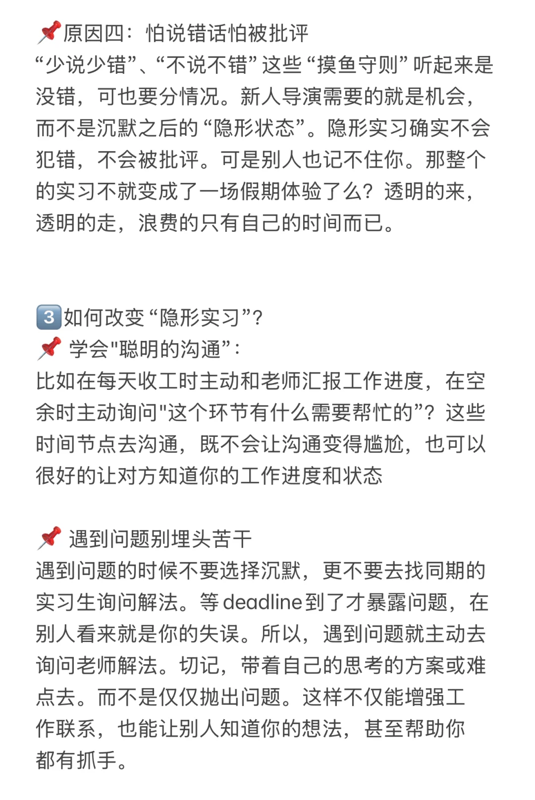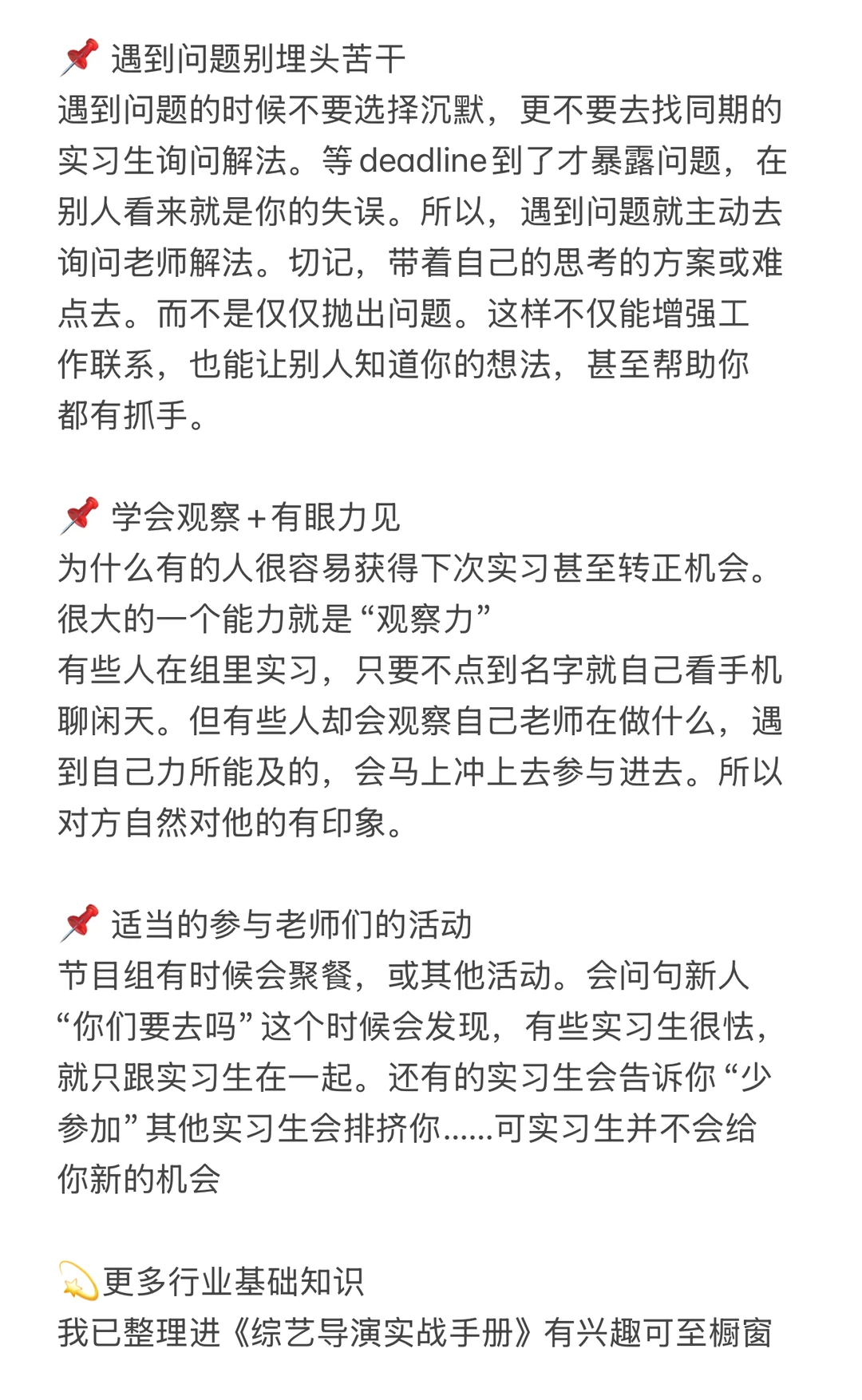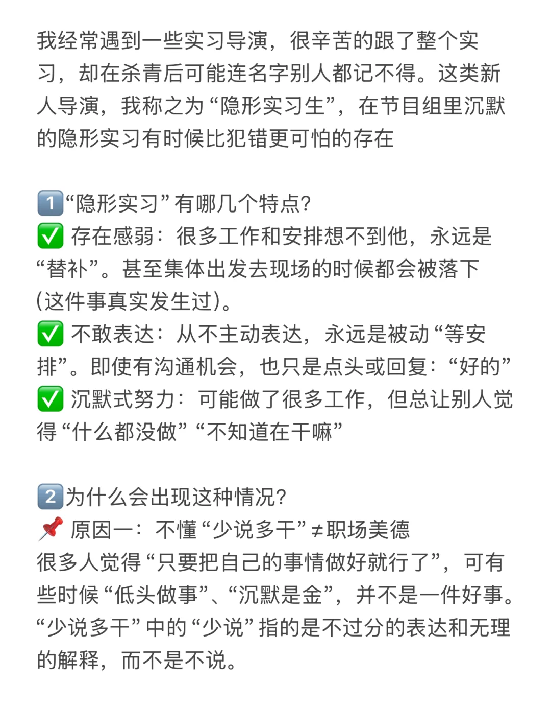 我经常遇到一些实习导演,很辛苦的跟了整个实习,却在杀青后可能连名字,别人都记不得。 这类新人我称之为“隐形实习生”。沉默带来的隐形实习有多可怕?为什么会这样?如何破局?这一篇和你仔细聊聊~ 💫更多行业基础知识 我已整理进《综艺导演实战手册》有兴趣可至橱窗