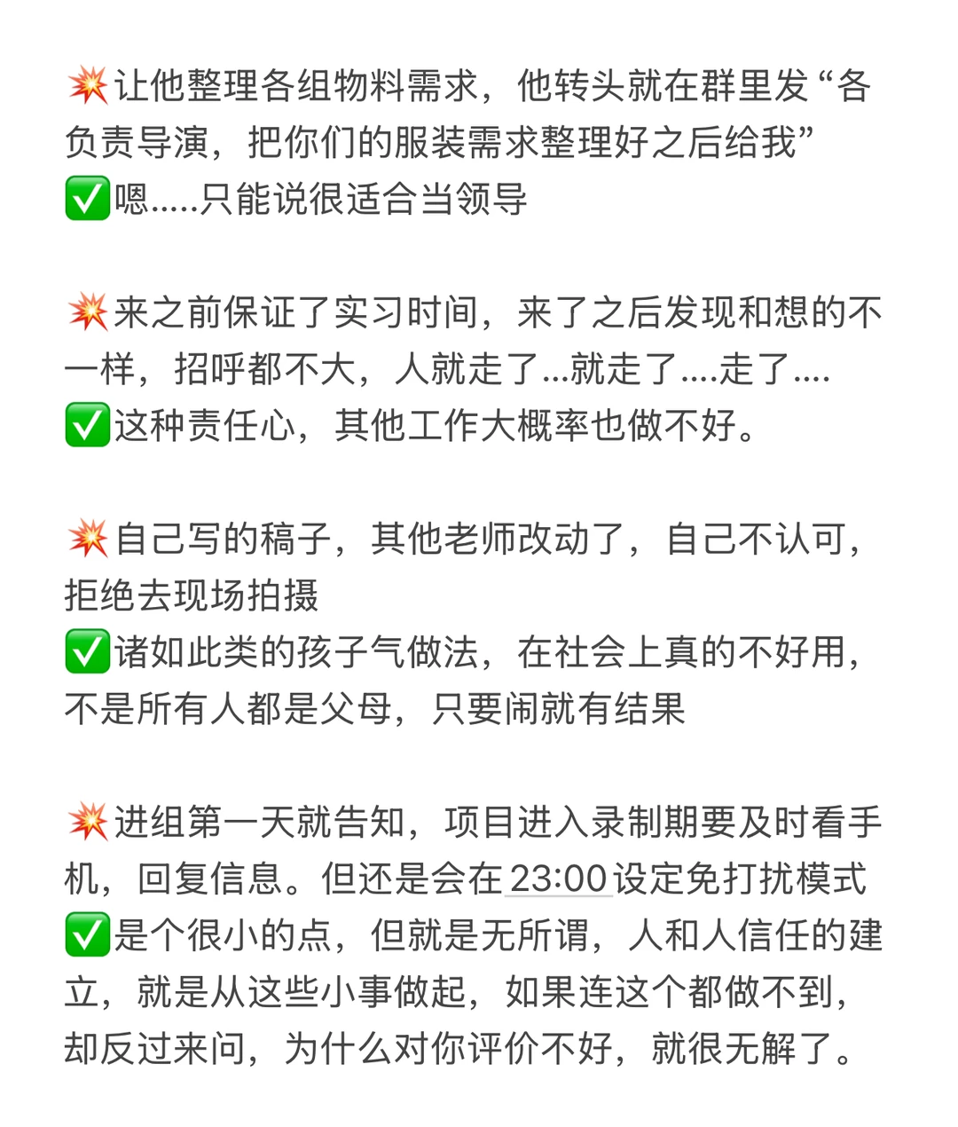 💥进组第一天就告知,项目进入录制期要及时看手机,回复信息。但还是会在23:00设定免打扰模式