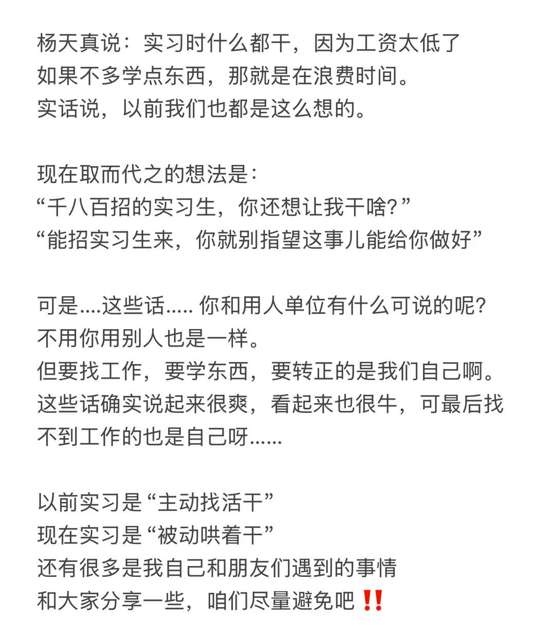 杨天真说:实习时什么都干,因为工资太低了