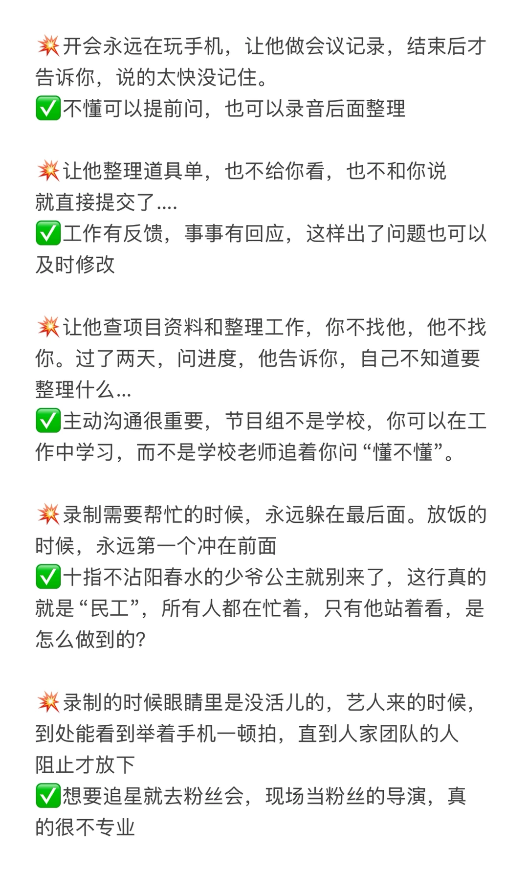 ✅主动沟通很重要,节目组不是学校,你可以在工作中学习,而不是学校老师追着你问“懂不懂”。