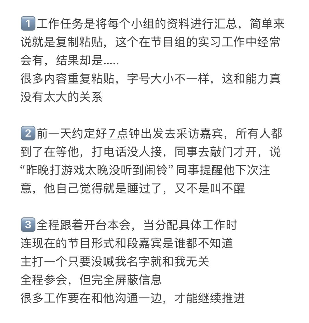 网上也有很多抱怨节目组“实习牛马”的经历