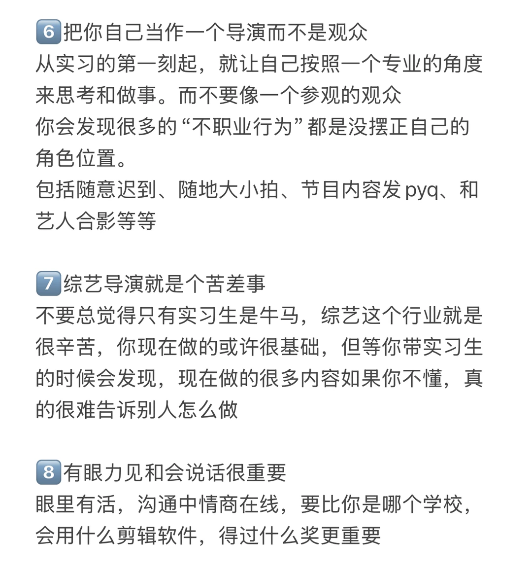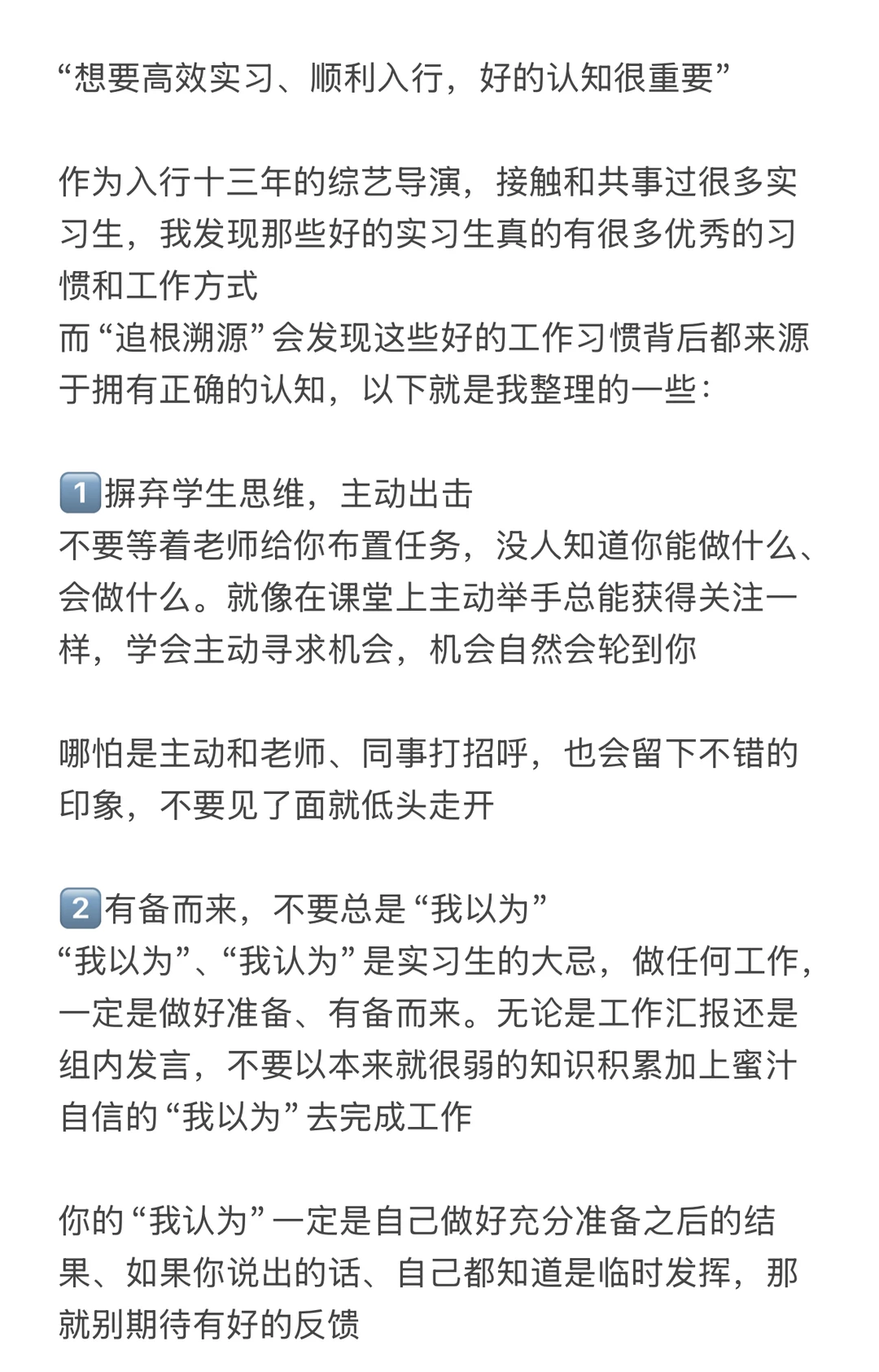 作为入行十三年的综艺导演,接触和共事过很多实习生,我发现那些好的实习生真的有很多优秀的习惯和工作方式