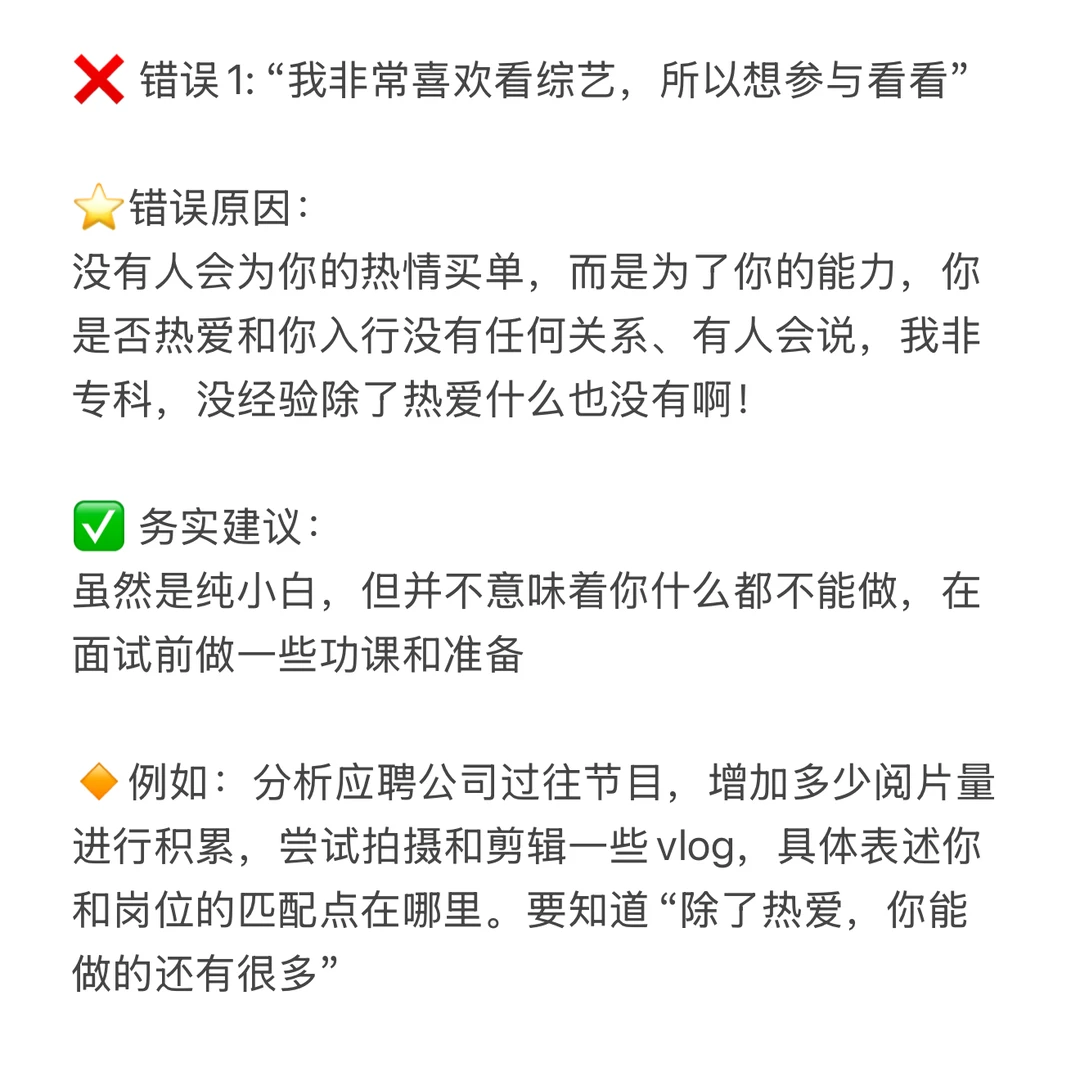 🔸例如:分析应聘公司过往节目,增加多少阅片量进行积累,尝试拍和剪一些vlog,具体表述你和岗位的匹配点在哪里。要知道“除了热爱,你能做的还有很多”
