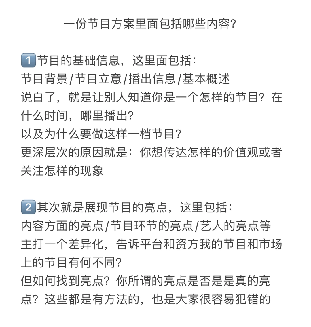 节目方案可以把你的想法具像化,更容易让平台和资方理解,有助于帮你把节目落地,也是日常最容易遇到的工作内容之一