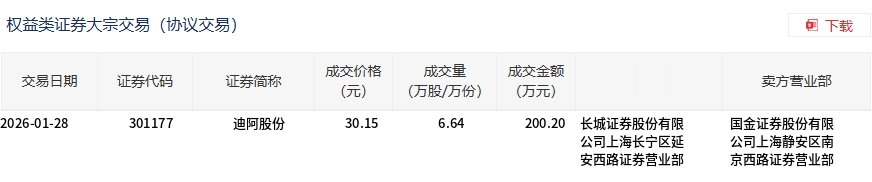 1月28日,迪阿股份大宗交易成交6.64万股,成交额200.2万元,占当日总成交额的0.47%,成交价30.15元,较市场收盘价38.76元折价22.21%。