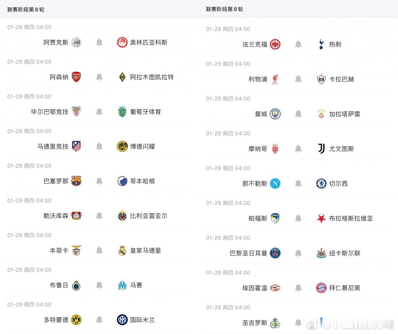 明晨4点大逃杀!欧冠末轮18场同开:8队同积13分,同分先看净胜球北京时间1月29日凌晨4点,2025/26赛季欧冠小组赛第8轮18场比赛同时开球。欧冠联赛足球 第7轮结束后,多达8支球队同积13分,末轮将为了仅剩的6个直通16强名额厮杀。由于同分情况下先看净胜球,预计末轮将出现各队拼命进球的“大逃杀盛况”!已确认晋级16强:阿森纳、拜仁慕尼黑已确认晋级16强或淘汰赛附加赛:亚特兰大、马德里竞技、巴塞罗那、切尔西、国际米兰、尤文图斯、利物浦、曼城、纽卡斯尔、巴黎圣日耳曼、皇家马德里、葡萄牙体育、托特纳姆热刺已淘汰:法兰克福、阿拉木图凯拉特、布拉格斯拉维亚、比利亚雷亚尔