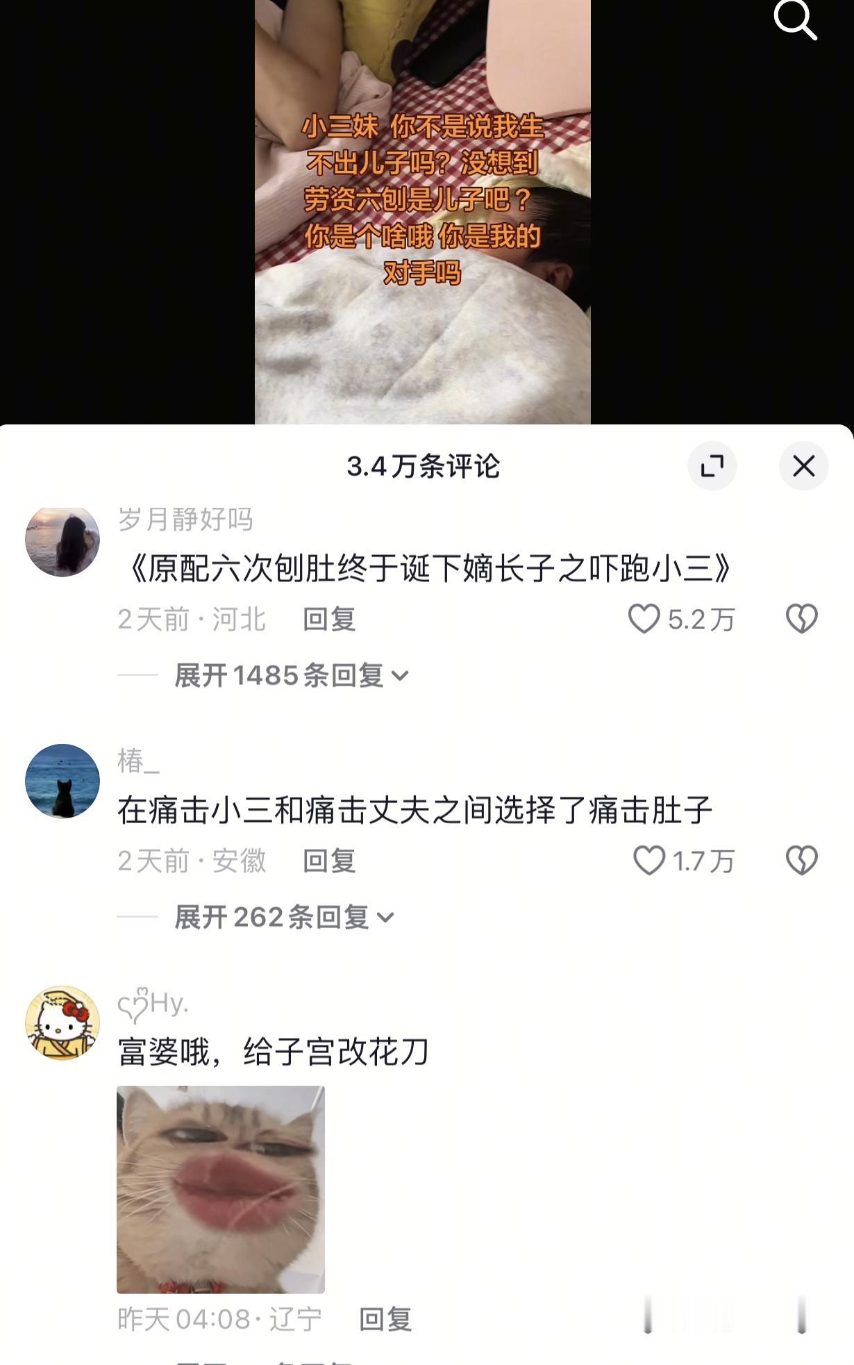 王宝钏一觉睡醒发现自己掉第二了。 刷到一个博主发的视频,视频配文:“小.三妹,你不是说我生不出儿子吗?没想到劳资六剖是儿子吧。你是个啥,你是我的对手吗?” 不是咱就是说你老公到底有多大魅力,他都在外面找三妹了,你还愿意给他六刨生个儿子。 网友吐槽: 1、三妹看完也是心疼的买了十斤红糖放家门口走了。 2、原配六剖终于诞下嫡长子之吓跑三妹。 3、在痛击三妹和痛击丈夫之间选择了痛击肚子。 4、富婆哦,还给子宫改花刀。 5、有嫡长子继位了,那些莺莺燕燕再受宠也是庶出[送心]恭喜皇后娘娘。 6、那些看不起你的,终于懒得看你了。 7、果然只有儿子才能留住老公吗?真是应了那一句话,儿子是爸爸上辈子的小[心]情[心]夫[心],这位女士你太伟大了,冒着生命危险为你的丈夫诞下了他的此生挚爱[碰拳][碰拳][碰拳][赞][赞][赞]