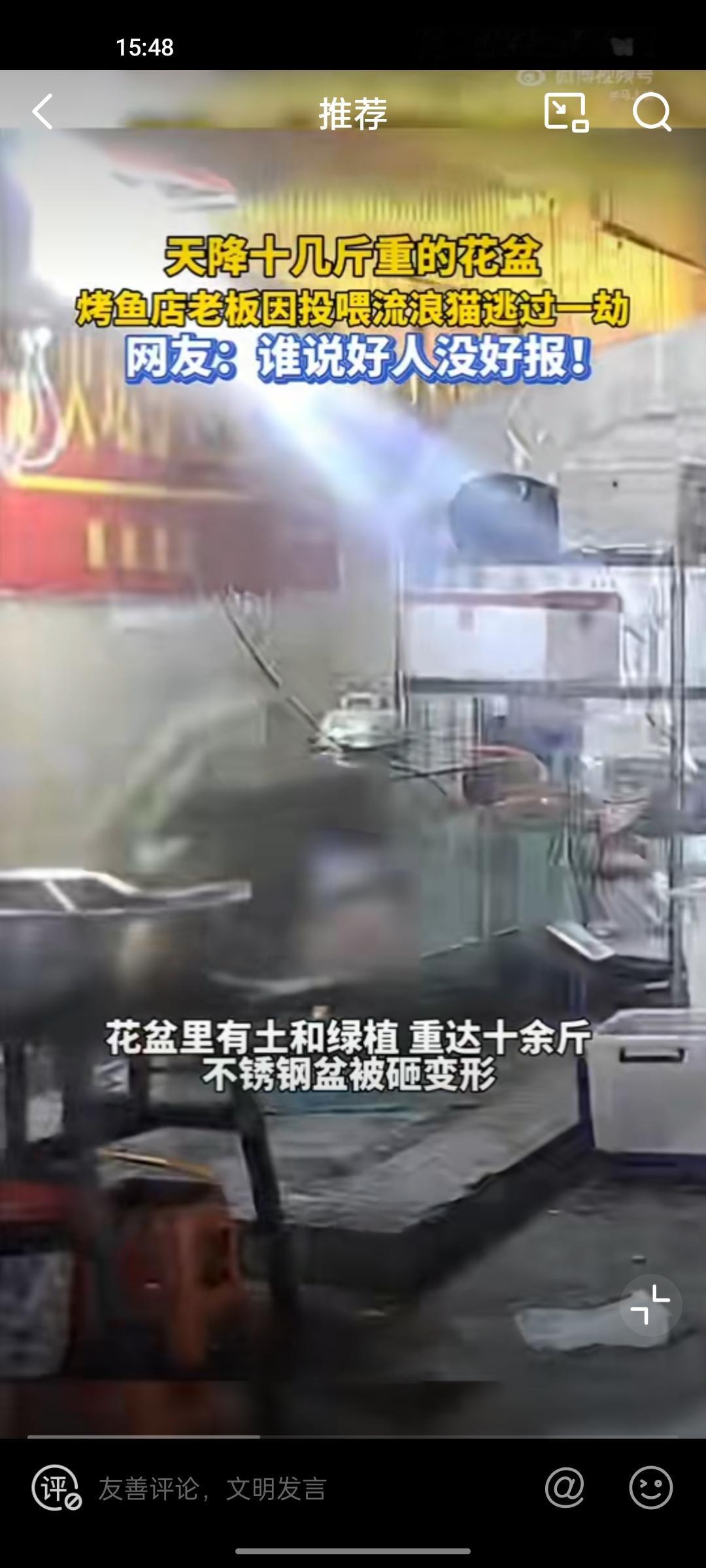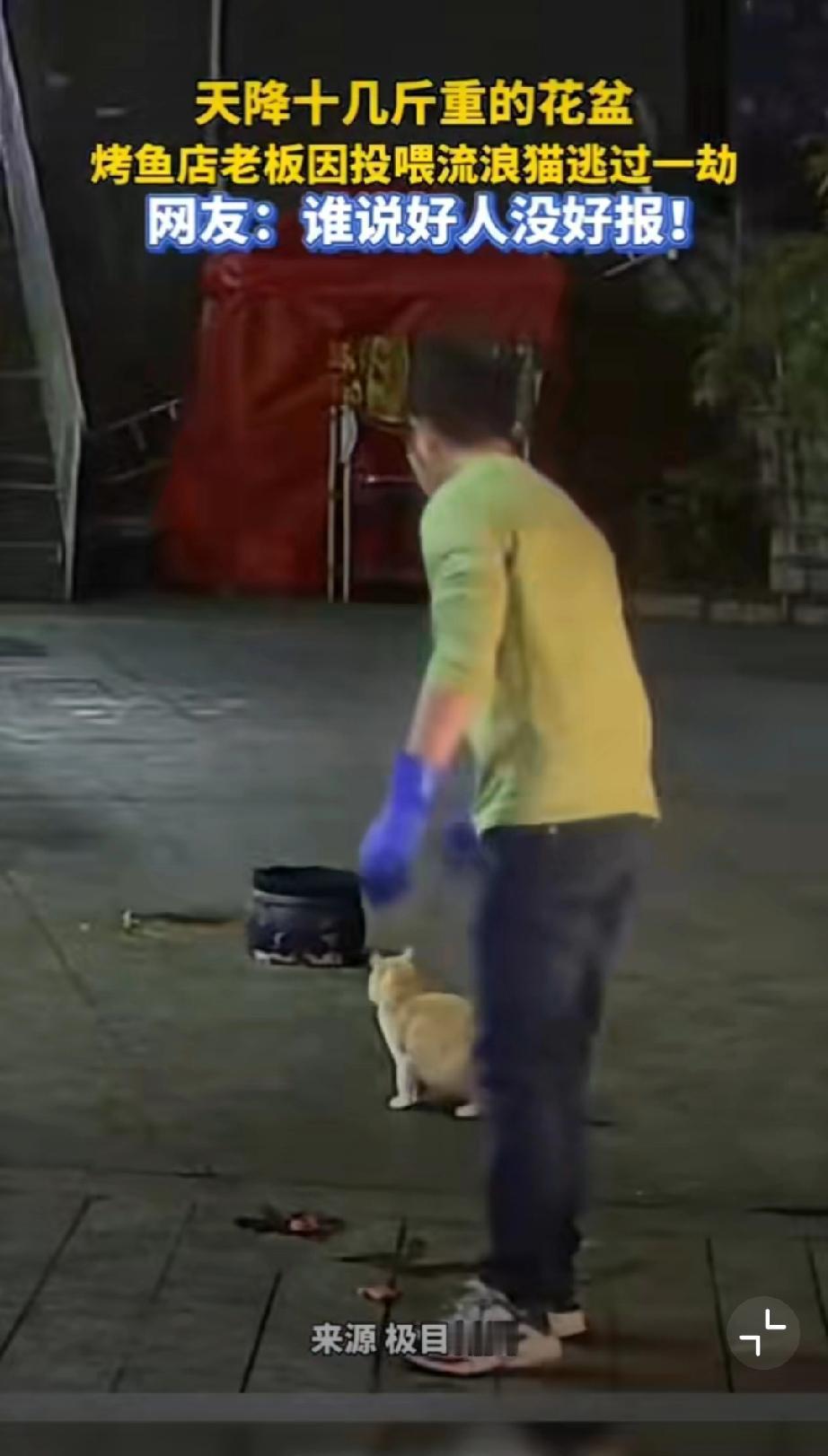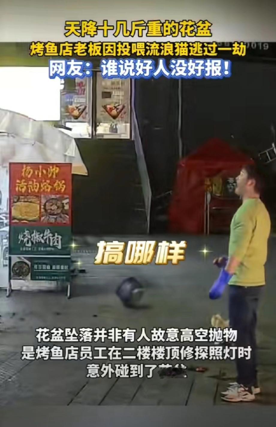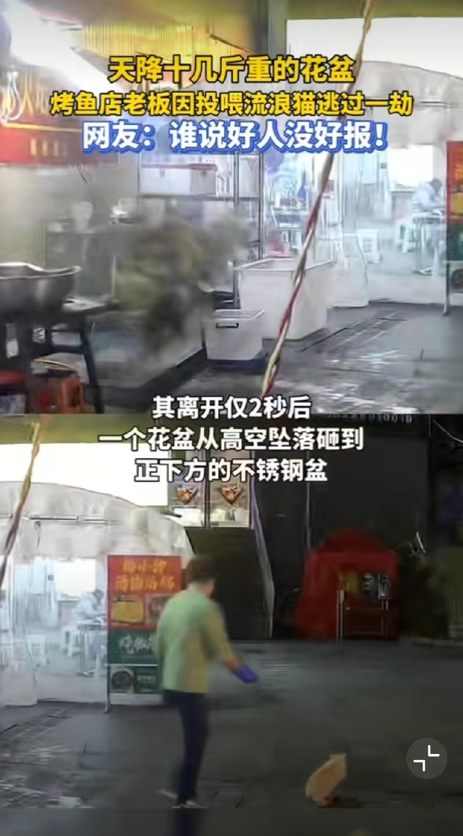 善良的回响,贵州一烤鱼店老板把鱼内脏喂流浪猫,刚离开摊位一个花盆从天而降!不说玄学,善良没错,但还得追责楼上住户,锅都砸出了坑,可见力道之大,不管是高空抛物还是坠物,都可以追责。 贵州身边事