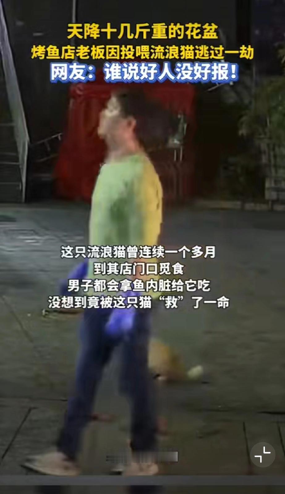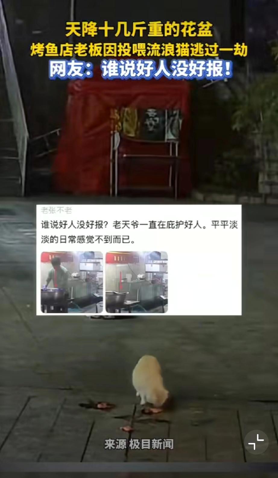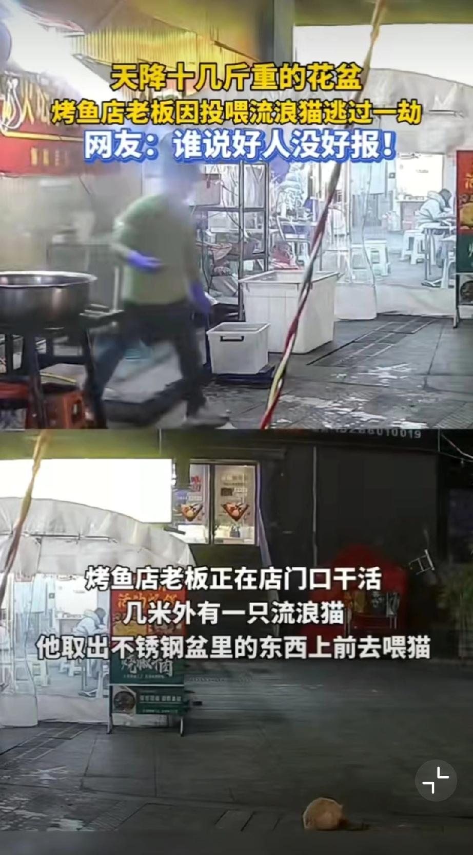 善良的回响,贵州一烤鱼店老板把鱼内脏喂流浪猫,刚离开摊位一个花盆从天而降!不说玄