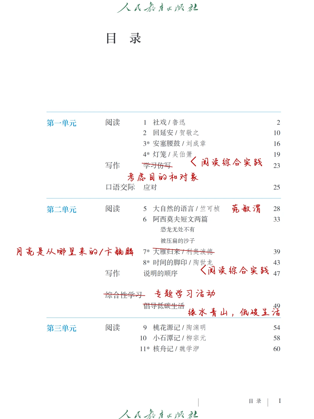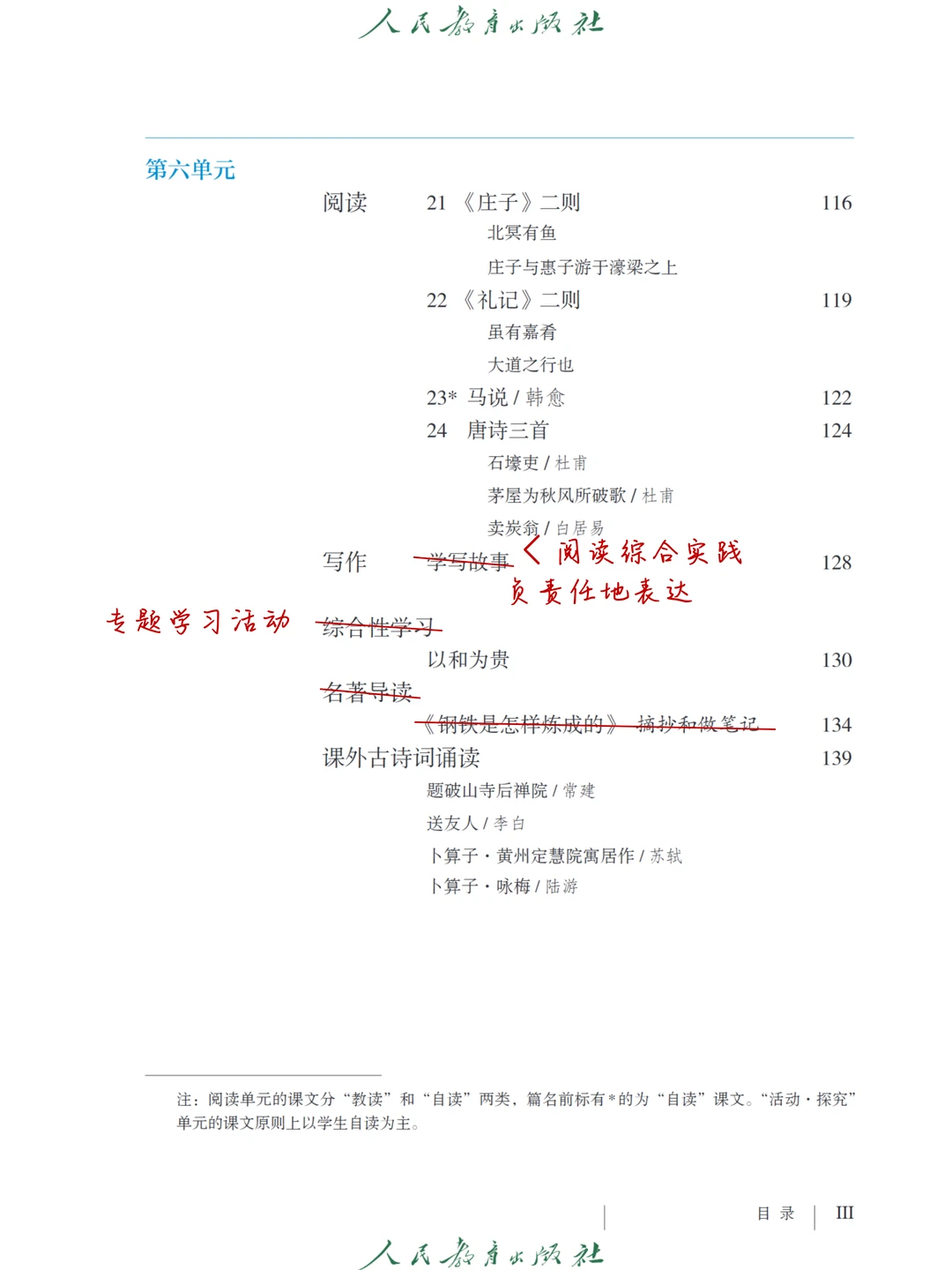 [二R]删除了第三单元的“综合性学习:古诗苑漫步”,第二单元“综合性学习”改为“专题学习活动:绿水青山,低碳生活”。