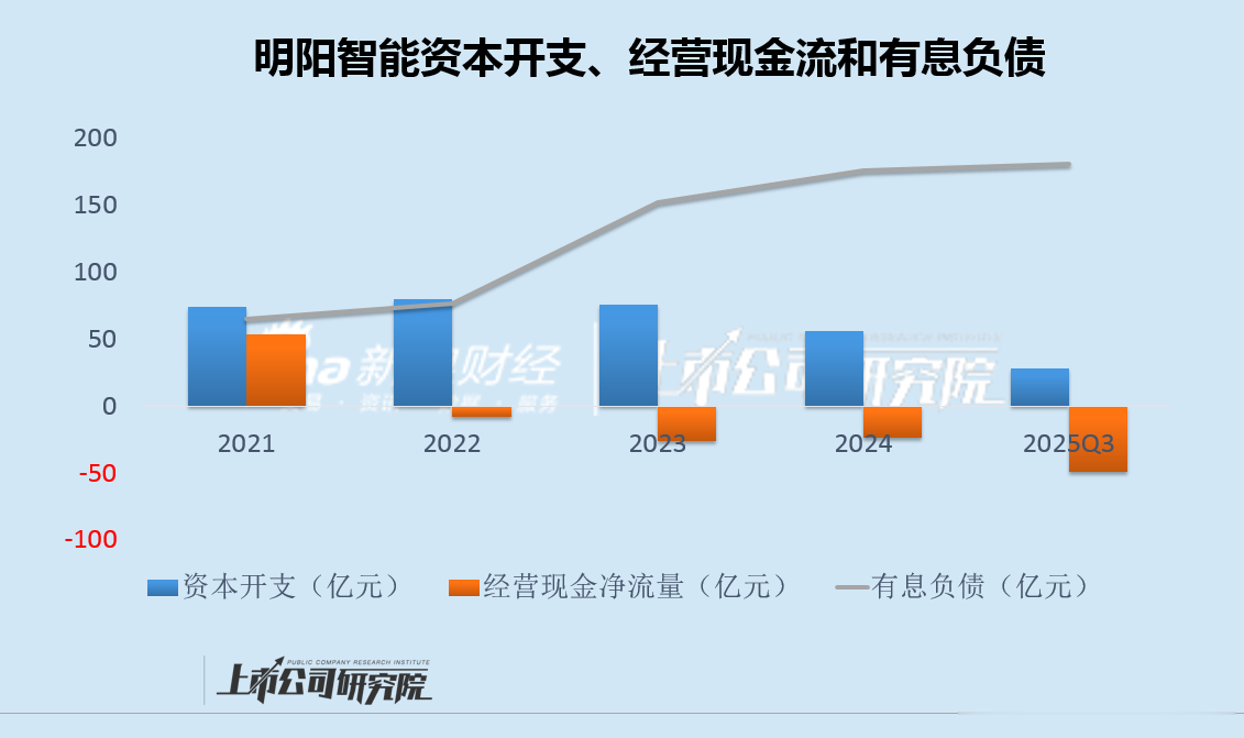 与此同时,明阳智能经营现金流持续净流出,2022年初至2025年三季度末,累计净流出额达107亿元,而资本支出长期保持高位,公司资金入不敷出,有息负债从76亿升至181亿,三年增幅达140%。