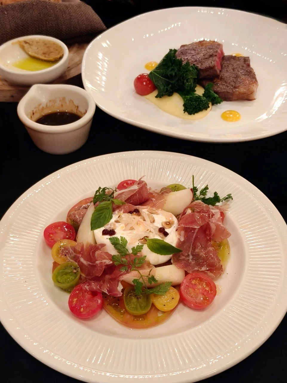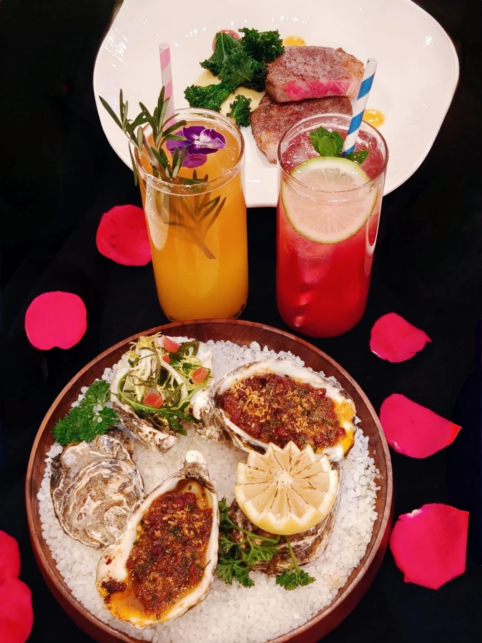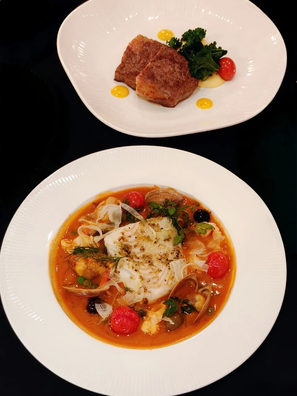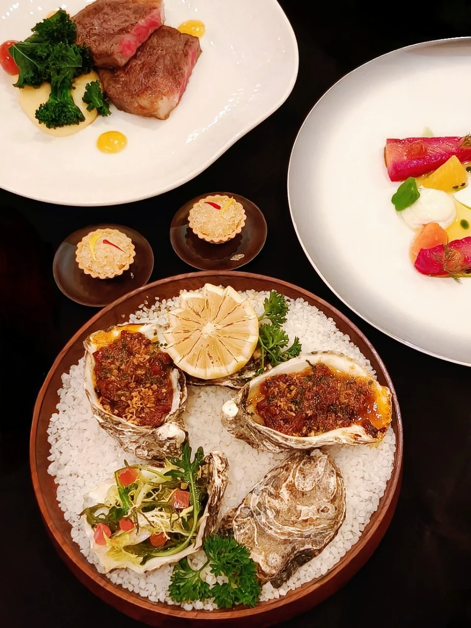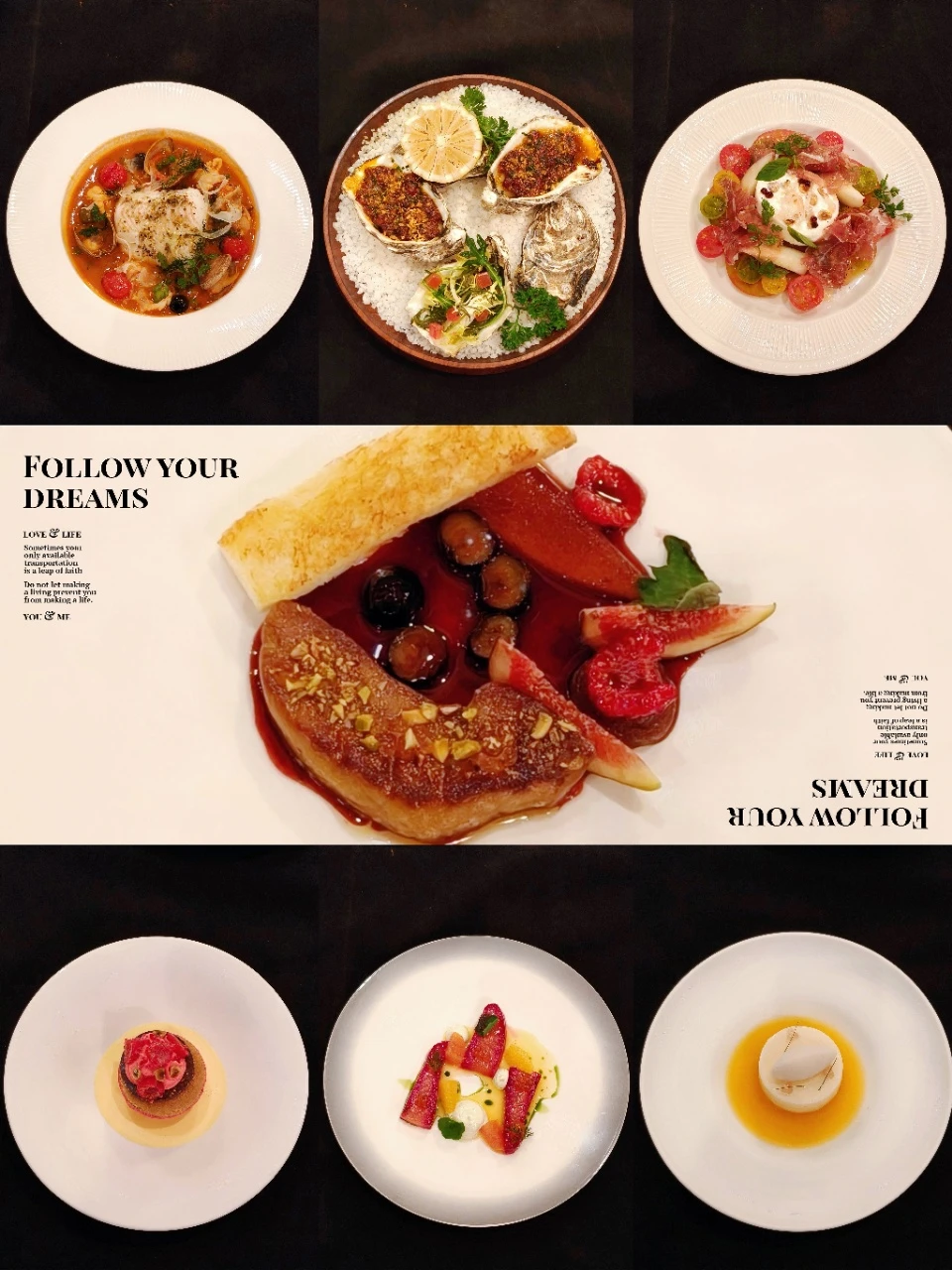 和闺蜜点的双人套餐绝了!冷头盘凯撒沙拉清爽解腻,烟熏三文鱼油脂丰润;香煎鸭肝绵密到入口即化,生蚝蘸特制酱汁鲜到流口水🦪 !主菜冰岛比目鱼嫩到弹牙,澳洲M5+牛排七分熟,入口爆汁肉香超浓郁~ 甜品柚子慕斯+树莓泡芙层次在线,气泡饮颜值口感双绝👍🏻