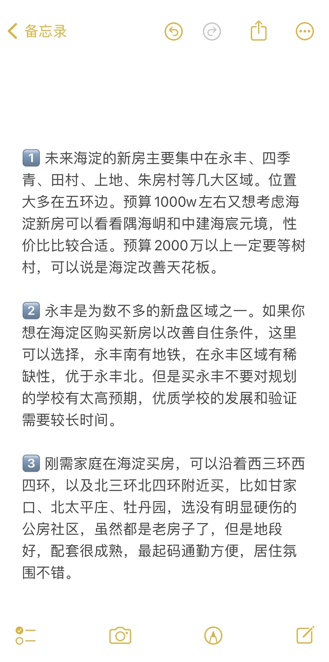 1️⃣ 未来海淀的新房主要集中在永丰、四季青、田村、上地、朱房村等几大区域。位置大多在五环边。预算1000w左右又想考虑海淀新房可以看看隅海岄和中建海宸元境,性价比比较合适。预算2000万以上一定要等树村,海淀改善必看! 2️⃣ 永丰是为数不多的新盘区域之一。如果你想在海淀区购买新房以改善自住条件,这里可以选择,永丰南有地铁,在永丰区域有稀缺性,优于永丰北。但是买永丰不要对规划的学校有太高预期,优质学校的发展和验证需要较长时间。 3️⃣ 左滑图片,查看更多内容!