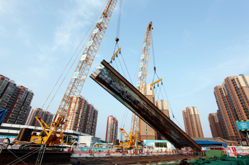 面对最大单体近50吨钢构件吊装难题,项目团队优化细部节点,借助BIM三维模型进行精细交底,明确节点部位的钢筋绑扎顺序和连接方式,创新采用“3台塔吊+1台260吨履带吊”协同作业模式,凭借精准的吊装控制,实现构件一次高精度就位,顺利完成总量超万吨钢结构安装任务。