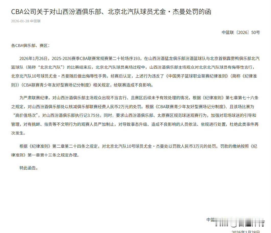 CBA公司这是什么处罚依据?杰曼被山西球迷吐口水,还要被罚3万? 而吐口水的山西球迷,至今没人知道是谁,只有山西汾酒俱乐部被核减联赛经费2万元,和被执行3.75分。 CBA公司这处罚标准,属实有些超乎外界的预料了,杰曼一个受害者反而还被罚最重,理由是杰曼向吐他口水的球迷,做出了侮辱性的动作。 怎么,球员以后面对这样吐他口水的球迷,还要给他鼓掌加油吗?