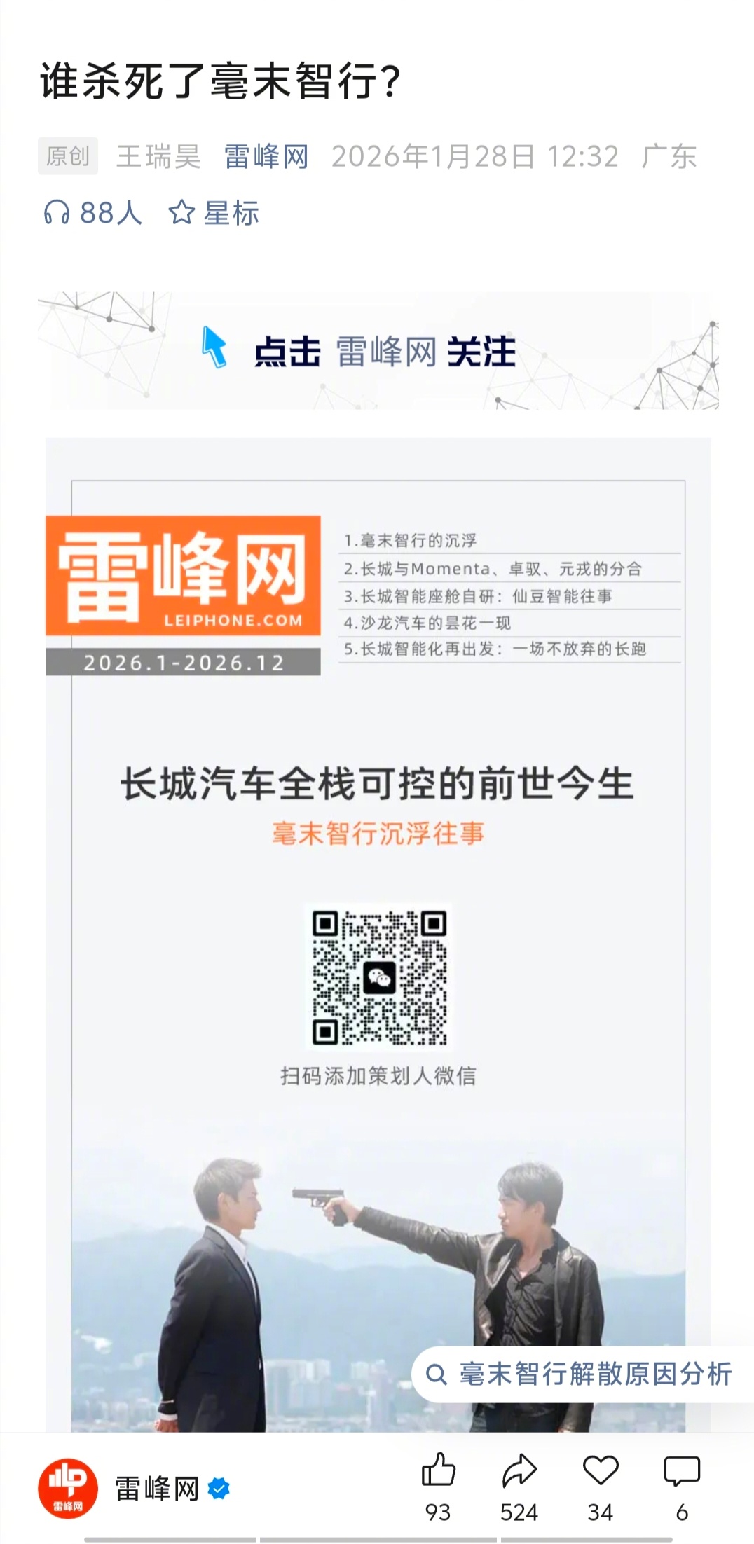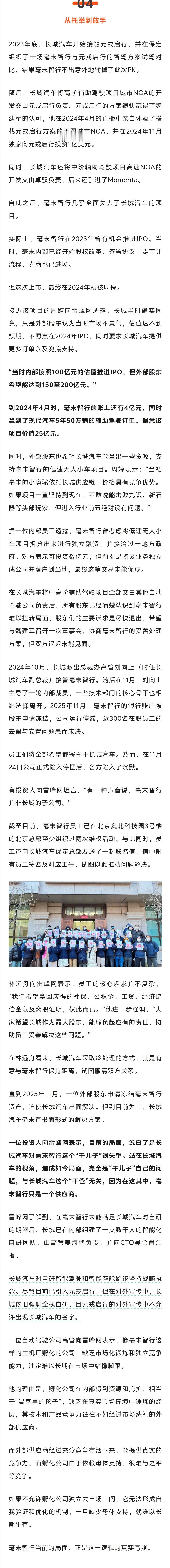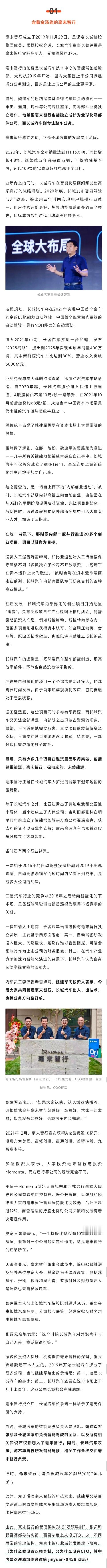 刚看到雷峰网发了一篇重磅长文,《谁杀死了毫末智行》,挺有意思的。文章有点长,我截图了,主要谈了几个问题。 一:剖析毫末智行解散原因。二:毫末智行诞生背景与长城内部创业。三:毫末智行战略路线与量产技术困境。四:高通芯片选型导致技术推进受阻。五:长城转向其他方案,毫末陷入绝境。