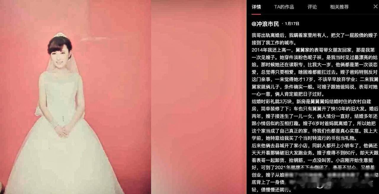 天津离婚表嫂住进表弟出租屋,直播生活引争议,20万债务迷雾难消 2025年春天,苏州一间五十平的出租屋,小雪和表弟小帅住一块儿了,她二十九,带着两个孩子,前夫两次出轨后人没了,留了十万债,小帅没跟家里说,直接把表嫂接来苏州,两人各睡一间房,他说就是想帮表嫂避避风头,这姑娘打小就没过上顺当日子,十岁爸妈离了,十五岁结了婚生了孩子,十年婚姻熬下来,搭进去的青春和钱,比谁都多。 但质疑声马上就来了,有人翻出小雪的社交账号,发现她离婚前几乎不露面,离婚后却突然开直播,镜头里总穿着新衣服,手里是新手机,指甲也常换,网友觉得她不像是被生活压垮的样子,还有人说她哭的时候表情太准,像掐着点演的,小帅的做法也被问,真想帮她,直接给钱或者租个房不行吗你,非得住一块还拍视频,是不是就想蹭流量。 这事把两代人的想法撞出了裂缝,小帅觉得表嫂吃了苦就该拉一把,可父母那辈人总觉得男女住一间出租屋总归不好听,小雪自己呢,从小被教着嫁鸡随鸡,离婚后债主上门,亲戚躲得远远的,网友嘴上说着心疼,可心里总觉得这事儿像编的,去年河南那对表兄妹分开住,事事都摊开说,也没见谁盯着不放,江苏那位前夫给前妻买了房,结果被人骂是想复婚,社会对男人帮女人、女人靠男人,从来就没个准数,全凭人嘴一张,风往哪吹,理就往哪倒。 妇联早就打算帮单亲妈妈还债、学手艺、找活干,可这些事没人愿意点开,大家更爱看英雄救美的戏码,现在小雪和小帅的出租屋,摄像头一直亮着,没人知道前夫是不是真没钱,那二十万有没有欠条,小帅的工资够不够养两个人,爸妈到底知不知道这回事,唯一清楚的是,生活一变成直播,连帮忙都得被人琢磨,你端来的热汤,人家第一反应是猜杯子洗没洗过。