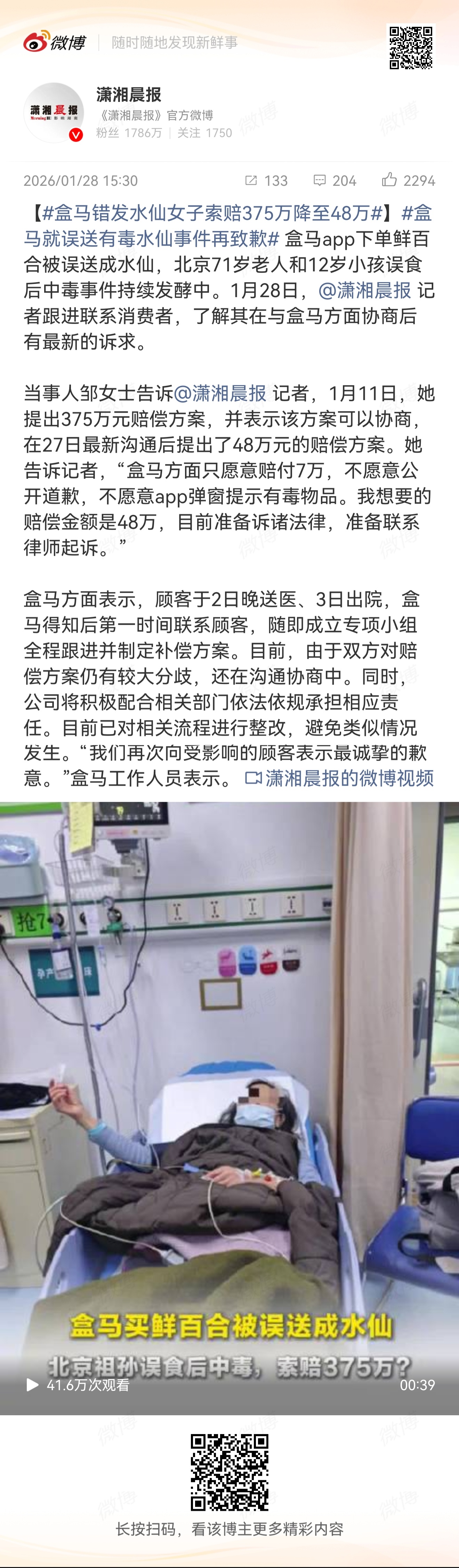 盒马错发水仙女子索赔375万降至48万 虽然我分的出来水仙和百合。但是你给我送水